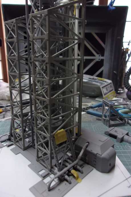 土曜日にふらっと立ち寄ったドラッグストアで奇跡がありました。いつも飲んでるブレンディより高級なマキシムが安売りしてる!!通常価格ですと約1000円と、一時期よりは価格が下がってきましたがこれはラッキー。あるだけ(とは言っても二つだけですが)購入しました。安い理由はお察しの通り賞味期限のためです。まあそんなのは味音痴の私にはノープラモデル、全く問題ありません。良い買い物ができました。はい、今週もタワー部分作りです。底の部分ですが当初はバツの付いている三角部分をカットするつもりでした。でも強度が心配なので予定を変更します。まず1.0mmプラ板を切り出します。外形は平日の仕事中にあれこれ考えて、設計図を書いておきました。カット加工して・・・箱組みします。この箱をタワーの根元に置いて基礎の強度を出そうというわけです。内部は変形しないようリブ等を張り巡らせます。プラ板はきっちり正確に切り出さないとぴったり合わないので難しいです。完成後に力の加わる箇所をあれこれ考えた結果、かなり多くリブを仕込む事になりました。箱組みするよりこちらの作業の方が大変でした。大体の形ができたので、パテである程度修正。強度が必要なのはタワーの保持だけではなくヤスリがけの際に力を込めて握るからです。こんな感じて取り付けます。仮組み状態でも三本あるタワーを根元からしっかりまとめています。でもこれだけではまだ心配なので、その他補強するパーツを作ります。0.3mm角棒の両脇を切り出した鉄橋のトラスのパーツでサンドします。きちんと直角三角形になるよう整形します。これらを背面に四個取り付けます。後ろ側にはあまり力が加わりませんが見た目、ちょっと物足りないかな~と思って付けてみました。では本日の全体確認です。先週よりもはるかに安定感が増しました。今回取り付けた箱パーツのおかげで、このサイドにあるパーツは単なるお飾りになってしまったかも?背面から。やはりこの三角パーツがあると多少ですが強度が増すみたいです。では頭も乗せてみましょうwお~っ、まったくグラグラしません!(カタパルトは横にしてあります)見た目のバランスも良くなったと思います。これだけの強度があればメタリオンが付いても大丈夫でしょう。たぶんだめならば更に手を加えます!