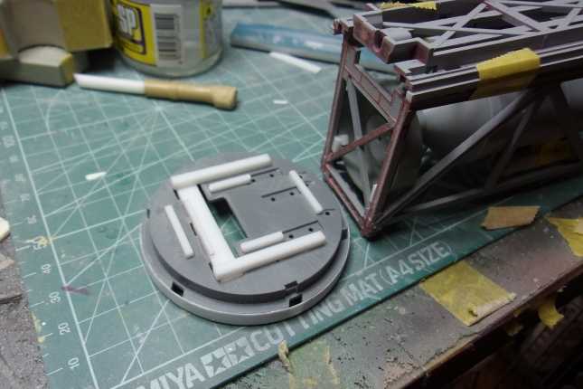 んー・・・何だか体調がいまいちな日々が続いています。気温だけではなく天気も晴れたり曇ったり雨が降ったりと毎日違っているのも原因かもしれません。さすがに40℃を超えることがなくなったのだけは助かります。さて今日も今日とてタワー作り。一体いつ完成するのか全く先が見えません(;^_^Aでも進んではいますよ。タワー中央部の出っ張り部分です。中が空っぽなのでここもタンク状のパーツを入れます。白く見えるタンクは大昔のガレキの余った部品。台部分をプラ棒等で組みました。こんな感じになります。正面はジャンクパーツでデコらせました。ただこのタンクのパーツは古い物なので形状がかなりいい加減です。サフとパテである程度形を整える必要があります。プラペーパーでディテールアップ、そして戦車の転輪パーツで長さを調節しました。サフで仕上げて完成です。今日は形だけでもタワー内部を完成させます!四本立つタンクですが、わざとグラグラな状態にします。最終組み立て時に垂直になるよう接着させる予定です。タンクには足場の様な物がありますがこの部分のせいで位置決めが困難になりそうです。タワー両脇に付くパイプの正確な形がようやくできました。このタワー左右対称な作りですが、微妙に寸法が異なっているので微調整に時間がかかりました。ちなみにタワー背面にはこの様な逆U字のパイプが付きます。この様な位置に付きます。そして、大まかな形は完成です。もうきりがありませんw後は細部を作ります。タワー内部のスカスカ感がいくらか無くなったかと思います。では本日の強度確認をしましょう。ひえ~理屈では大丈夫なはずですがやっぱり怖い!でもグラグラした感じは全くありません。ついでにメタリオンも乗せてみましょう。想像以上にしっかりしていて一安心。これなら問題なく支えられそうです。ただし接着作業はかなり神経を使うことになりそうです。メタリオンも表面モールド等などの作業がまだまだ残っていますからね。先はまだまだ長いです。デカールも今回は自作を考えています。~おまけ~今回までのこの記事、メカ作りばかりでどこがねる子さんやねん!と言われそうなので気が向いたらですが、今回から形だけでもねる子さんの画像を挟み込んで行こうと思います(;^_^A