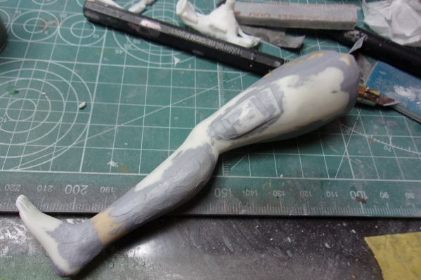 GW三連休はずっと引きこもってライザ作りをしていました。まあ出かけるような場所も予算もないですからw大まかなパーツ間の合いは確認できたので体形のボリューム調整に入ります。調整とは言ってもそのほとんどがボリュームアップですけどねwまずは気になる所にプラ板を重ね張り。それでもボリュームが足りなかったのでパテ盛りしました。五月に入って昼間の気温は高くなってきましたが、パテの硬化時間短縮のため食器乾燥機がフル稼働です。加工していく過程で気になったのが左太ももの中心線です。キットでは赤い矢印が中心でしたが、太腿の幅を広くしたため黄色い矢印まで移動させます。納得できるラインにならなかったので更にプラ板を重ねてボリュームアップします。その際にどうしても隙間ができてしまうので瞬間接着剤をたっぷり流し込みます。右脚のニーソ部分ですが、太腿部分を加工しすぎてこの様にかなり不自然な形状になってしまいました。これで塗装すると本当にみたらし団子になってしまいます。特に口部分の細さが気になるのでここもプラ板を巻いて太くします。この後、段差は伸ばしランナーと溶きパテで仕上げました。ふくらはぎや関節等もボリュームアップします。だいたいこの様な感じになります。みたらし団子表現も捨てがたいですが作ってるととても違和感あるのでこれでいいかと思います。まだ途中ですが左脚はネットで人体解剖図を見ながら加工していたら、結果的にほぼ全体が作り直しとなってしまいました。モニターでは見辛いので、今後のフィギュア作りのために人体解剖図(特に筋肉)のポスターを買おうと本気で考えています。背面と腰周りもプラ板とパテで・・・以下同文。完成見本ではさほど細くは感じないんですけどね・・・。と思って改めて見るとやっぱり細いですね~。胸はこの大きさでこの形はどう考えてもおかしいので手を加えます。まるで重力を無視したように上に向いています。現在は鉛筆で書いた部分にストラップを付ける予定です。問題はそのストラップをどの様に背中に持っていくか悩んでいます。あまり下着下着したくはないので。三日間たっぷり作業した割には進みませんでした・・・(;^_^Aシンプルな分、ごまかしがきかないキットだというのを痛感しました。それにしても太くなってきましたねw