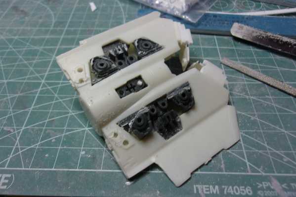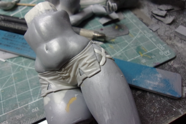 日曜恒例の尻いじり・・・じゃなくてライザ作りです。あ、実際お尻いじってた時間も結構長かったかも(;^_^Aまずはブラのストラップから。細切りにした紙をカミカタメールに浸してからサフ吹き。紙は細くカットしたものとそれより気持ち太くしたものの2種類あります。二股に分かれている部分が細く、一本の部分が太くなっています。わかりにくいですがエッチングパーツでアジャスターを再現してあるので実際に長さを変えることもできますwあらかじめイメージは決まっていたのでそれほど時間はかかりませんでした。こんな感じで付きます。Yの中央部も金属でできているので強めに引っ張っても強度に問題はないでしょう。さて先週軽く凹んだお尻部分です。パーツの位置もしっかり決まってほっとしたのですが・・・完成見本と違ってお尻がほとんど隠れてる!なのでヒートガンで再度曲げ直してお尻が出るようにしてみました。ん~~~どうやってもここまでしか露出できません。しかも右手部分にブラウスの裾が届きません。これは元に戻してお尻はあきらめましょうか。な~んちゃって。このまま完成させたら絶対後悔するので是が非でもお尻を見せます!加工しやすい箇所を見つけて真っ二つにします。もし失敗したら・・・いいえ、何とかします!ここだ!という位置を見つけて軸打ちします。約2cmも間が離れてしまいました。隙間をエポパテで埋めます。しっかり硬化するまで時間がかかるので本日はここまでですね。前から見ると加工前とあまり変化はありません。ちょっと残念かも。でも後ろはこの通りお尻丸見えになりました。オリジナルの製品よりも出ています(;^_^Aさてあとはこのパテ埋めした部分をどのように処理するかが問題ですね。裾をつまんでいる右手部分も完全に作り直さねばなりませんし。