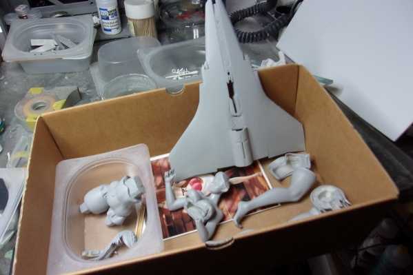 部分的にはですがパーツの加工も終わり、パーツの隙間調整に入りました。とは言え塗装まではまだまだ先の話ですが。ホットパンツの左側には大きなスリットがあり、その中にクロス状のパーツが付きます。でもここの隙間がどうしても上手く処理できません。悩んだ末にすべてパテで埋めてしまいました。クロス部分は紙等で自作します。胸はほとんど球体ですね(;^_^Aこのカップで支えているのはどう考えても不自然なのでストラップを追加します。一本だけだともろに下着になってしまうためサイドとフロントの二本で吊り上げます。後ろはV字にまとめます。完成するとその先にはリボンが付くようになります。紙で試作してみました。太いとババブラ、細すぎると水着みたいになってしまいます。なかなか難しいですね・・・。両足の加工がほぼ終わりました。手を加えまくったので人間のそれにかなり近い形になったかと思います。まあフィギュアなので多少のデフォルメはありますが(;^_^Aムチムチですwホットパンツの右側の後ろ付け根部分には破れた穴があります。そこから覗いている部分とホットパンツの隙間がひどかったのでパテで修正。ちぐはぐだった左右のお尻の大きさもそろえられました。さすがにこの穴からお尻のお肉ははみ出ないでしょうねwその他パーツ間の大きな隙間や段差は伸ばしランナーで調節しました。一か所を直すとそのパーツに付随するほかの箇所の修正が、またそれに付随するパーツが・・・と、修正箇所がどんどん増えてしまいます。それでも手を動かし続ければいつかは終わる!と言うか終わらせました。あれこれ気にしていたら絶対完成しませんからね。本日の仮組み。見ている方には「先週と同じじゃん!」とか言われそう。おまけ初めて駿河屋でお買い物しました。購入したものは1/100 アトリエ彩 ビックバイパー(グラⅡver.)すでに絶版となっている製品ですがあまり人気が無かったためかほぼ定価で購入できました。1/100と、以前製作したキットより若干大きめです。で、なぜ購入したかといえば・・・先日突然次回作のイメージが脳内に降りて来たためです。もしかしたら現在作っているライザを中断するかもしれません。ちなみにこの様な形状に改造してフィギュアと組み合わせて作るつもりです。あ、わかる人にはわかっちゃったかもw