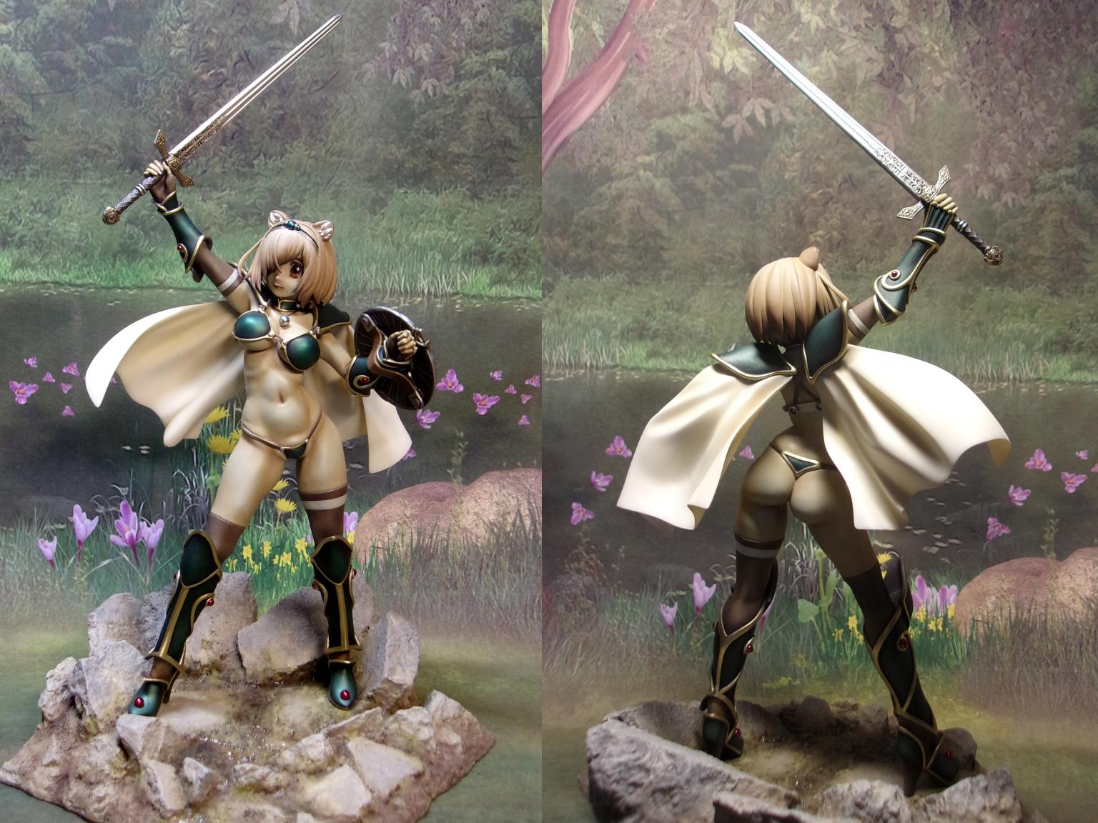 昨年末から開始した、ねる子さん作りもオーラスです。今日は朝から気温が高めだったのでゴリラの硬化も早めで作業がはかどりました。瞬間接着剤を使えば一時間程度で終わりますが、そうすると衝撃に弱い仕上がりになってしまうので最近ではほとんど使わなくなりました。まずは肩アーマーから。ペンダントは仮止め状態にしてあります。もう片方はティッシュペーパーなどをはさんである程度硬化するまで待ちます。続いて頭部を付け、これもある程度硬化させたらシールドを持つ左手を接着していきます。真鍮線を仕込んで固定させていますが、それでも重みで傾いてしまうためその辺にある物で支えて硬化を待ちます。ラストパーツの右腕です。フィギュア本体に対する剣の向きと角度付けが地味に難しかったです。柄と握り部分はあらかじめ前日に接着しておきました。というわけでできたぬき~!(あ、若い人には元ネタ古いかw)おおっと、いきなりピンボケ。問題(!?)のお尻の見え方はこのようになっています。やはりマントのある方がお尻の見え方のわざとらしさを軽減できて良いかと。実物は写真以上に目立っていますけどねw頭の上に葉っぱを付ける構想もありましたが、ビキニアーマーと合わない気がしたのでやめました。気が向いたら後付けできますしね。体形はあれこれ加工した結果、ぽっちゃりになる予定が意外とマッチョになってしまいました。個人的に今作の反省点です。キット付属の物より一回り小さい盾ですが、ビキニアーマーにはちょうど良いサイズに感じました。それにしてもこの剣と盾は本当に良い出来で、塗装がとても楽しかったです。ここだけの話ですが、作っている途中でねる子さんから怒られるのではないかと結構ビクビクしてたりして(;^_^Aでも私以上にセンシティブな作品を描いている方がいるから大丈夫!・・・と自分に言い聞かせて作り続けました。マントと肌の色が似た系統になっちゃったかも・・・orzでもグレー系だとすごく冷たい感じになってしまうのでこのようになりました。というわけで、今回も無事完成しました。きちんとした撮影画像は後日ライブドアブログの方にてUPします。ところで・・・実はもう一体ねる子さんのフィギュア制作の計画があります。キット自体が手元に無いのでまだまだ未定ですが。