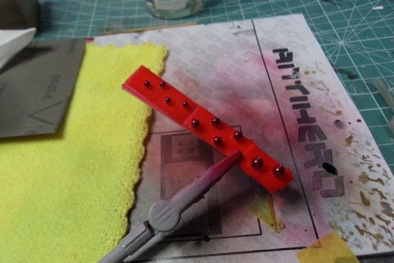 わーしゃも今日からお盆休みです。超忙しい中、何とか三連休をもぎ取りましたwこの連休中にライザを完成させる予定です。ビーズを割ってネックレスのパーツを作ります。なかなか思い通りに割れず苦労します。そばにある針金が紐になります。瞳が入りました。デカールのままではもろ印刷なので鉛筆やエナメルで描き直します。途中、前髪のパーツを付けてバランスを見ます。ライザは他のフィギュアと比べるとハイライトが小さいので表現が難しいです。下半身を組み上げちゃいます!左脚と胴体の継ぎ目を自作パーツで隠します。後に付くホットパンツと結構干渉するのでちょっと不安。下半身ほぼ完成。細かい修正はまた後日。ディスプレイ台と花台は3Mの強力両面テープで固定します。当初はフィギュアを固定する真鍮線を延長させて接着するつもりでした。でもこのテープならば強力に固定でき、いざとなればはがして使えるので便利です。上半身を付けてみました。やはり胸の大きさに対してブラの作りがおかしいですね。隙間埋め、クリアー吹きなどなどまだ作業は沢山ありますが、三連休もあれば完成するはず・・・。あ、明日は姉の所へ出かける用事がありましたwでももうここまでくれば完成は近いです。