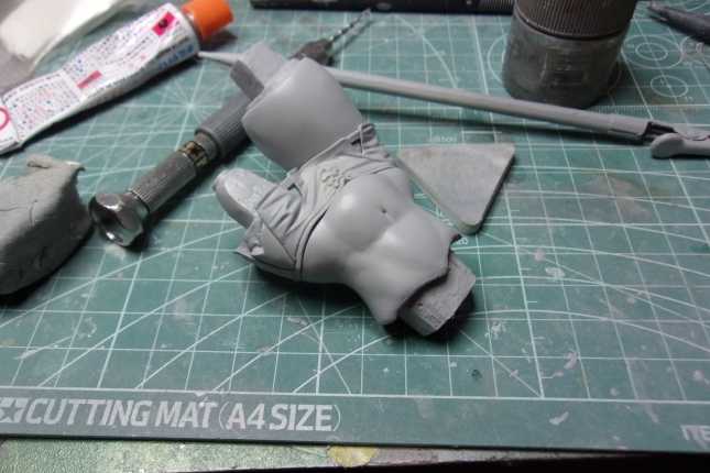 ここ数日我がグンマー帝国は朝晩暖房が必要なほどの寒さです。というか今年の五月は全体的に気温が低めでした。夏もこのまま低め・・・はないでしょうね。はい、今週もライザを作っていますが相変わらず表面仕上げが中心です。サフを吹いた後に仮組みをした後、丸で囲んだようなツヤのある個所があります。ここはパーツ同士がぶつかってできるキズなので必要に応じてペーパーがけを行います。私の場合は大量にサフを吹き付けるのでこの現象はよく発生します。先週接着したものの、気に入らなかったため作り直しとなった首部分です。プラ板で土台を作ってパテ整形後に軸打をする加工をします。さすがに一度では決まらないのでプラ板を挟んで角度調整します。そして隙間に瞬間接着剤を流し込んで接着。硬化したら首を太くする加工をしました。全体が太いのに首だけ細いままなのは変ですからね。股間部分を手直ししました。変化を付けながら内側をなだらかに彫り込みます。おわかりいただけただろうか?太腿の曲線のその向こう側にもう一つの(お尻)曲線が見えるのが。誰もそんなとこ見ないでしょうけどいいんです。こういうのが好きという病気なんです。首の角度はだいぶ変わりました。おかげで先週まで気に入らなかった反対側からの見栄えも改善できるようになったと思います。それにしても写真だとなぜか寸詰まりになってしまいます。ならば・・・と、横に寝かせて撮影してみました。あ、これですこれです。これが実物に近い正しいイメージです。立てて撮影した画像とかなり異なるかと思います。おまけ最近気になっているガレキです。①PSO2ジェネこのキャラは以前にも作りましたね。その時よりも顔が幼い感じになっています。でも体の方は相変わらずで・・・。よく見るととんでもないデザインです。②PSO2ジェネ同じくジェネです。前言撤回、こちらの方が色々ととんでもないデザインですw別角度からの画像もあるのですが、もうとんでもない事になっているためUPしませんでした。③ブレッディ何かのゲームキャラらしいのですが詳細はわかりません。それはさておき・・・これはいい!発売がいつになるのかはまだ未定ですが購入決定です。とにかく太いキャラは作るのも塗装するのもとても楽しいんですよ。