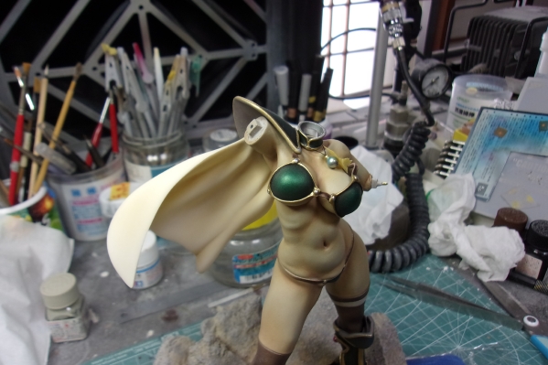 花粉症がひどいです。咳は出るしかきむしる程の目のかゆみはするしで仕事も手に付かない状態です。売薬で何とかごまかしていますがあと一か月は苦しむでしょう。しかし、模型作りしているとその症状が全く現れません。精神的なものもあるんでしょうねw予定より早いですがディスプレイ台に水表現のシリコンを流し込みます。泥水っぽくするためサンドイエローで着色しました。第一層目なのでちょっと濃い目に。完全に乾くまで数日かかるため時間を見つけては少しずつ流し込みます。マントを塗装しました。シャドーはエナメル、ハイライトはパステルで仕上げました。う~ん、影の色が濃すぎたかもしれません。見直す可能性大です。剣と盾の塗装もしました。基本塗装した状態です。ちなみに元は金一色でした。でも質感は素晴らしかったので当初はこのまま使用するつもりでした。影やレリーフ部分をエナメルで処理しました。そして刃の部分をオイルストーンで研ぎなおして地の金属をむき出しにしました。多分ですが錆びることはないと思います。盾はマスキングが大変でした。もしかすると塗装に一番時間がかかったのはここかもしれません。基本塗装状態です。アーマーと同じく緑にはせずあえて赤くしてみました。ちなみにこの赤部分も新色のベルベットカラーです。元状態画像。シンプルですが剣同様に質感が良くて、再塗装しようかどうかかなり悩みました。こちらもエナメルで仕上げて完成です。ちょっと派手ですがフィギュアに付くのでこれくらいでいいのではないでしょうか。アーマーもほぼ仕上げです。金で塗装した部分は傷付きやすいので取扱いに神経を使います。はい、本日のお尻・・・じゃなかった、仮組みです。わかりにくいですが肌部分を部分的に半ツヤでコートしました。半ツヤになることによってお尻とお腹の質感が更に良くなりましたw接着手順を考えながら組み立てます。今回も難しそうな予感・・・。そして今回からトップスが付くようになりました。こんなにおっきいの、ねる子さんじゃない感が半端ない・・・・・・はっ!?肩アーマーがないと完全に浮いちゃってますね。このトップスは中央で分割されていたため、接着後に割らないよう塗装するのがちょ~~~~大変でした。