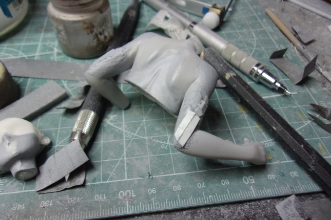 このライザ作りももう長いな~と思ったらまだ二か月程度でした。あ、普通の人から見れば十分長いかも。本体作りがほぼ終わったのでこの脱ぎかけのブラウスの接着位置を決めます。オリジナルのキットではこのブラウスと太腿との間に大きな固定用のピンがありますが、とても見栄えが悪いため削り落としてしまいます。なので力の加わる手首部分はがっちり固定する必要があります。ここの固定用ピンも削り落としてパテで平面にします。金属線でしっかり固定させます。ただ位置を間違えるとブラのパーツが入らなくなるので注意です。手首のひねり具合で何とかなりそうですね。とは言っても無理矢理はめようとするとパーツにキズが付くほどギリギリです。瞬間接着剤とゴリラグルーで接着。しばらく置いて効果を待ちます。その間に髪の仕上げを。相変わらず細いパーツが多いので取扱いに神経使いますw右サイドヘアーと肩の間に隙間があったため、細く伸ばしたパテで髪の毛を作ってその隙間を補完しました。パーツ間の隙間も修正。特に頭頂部はひどかったので。接着剤が固まったので組んでみました。手首はこの位置で大丈夫・・・なはず。早速ブラウスの位置決めです。まあ・・・全然合いませんでした。なのでヒートガンで曲げて慎重に調整します。こんなもんかなー・・・。ブラウスのパーツ自体は薄くて曲げやすかったのですが、手で持つ部分は厚くて手こずりました。あっ!?完成見本と違って、苦労して作り込んだお尻がほとんど見えなくなってる!!軽く凹みました・・・。