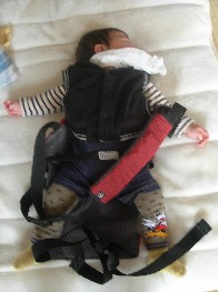 9ヶ月5日目()今日はめずらしく2回も公園に行った。歩いて15分以内の範囲に小さな公園が3つくらいあります。よく見かけるブランコは、2本の鎖の下に板が渡しているだけですが、そのうちの1箇所の公園には、座席部分が歩行器のような形をしたブランコがあります。息子がまだ首も座っていない頃に近所を散歩していて見かけたのだけど、場所がわからなくなってしまいそれ以来行ったことがありませんでした。先週の日曜日にその公園を久しぶりに発見し、場所をやっと覚えました。で、ちょっと遠回りだけど、今日からお散歩やお買い物コースに入れてみました。午前10時頃行った時は公園には誰もおらず貸し切りこのブランコだと、一人でも座れます先週日曜日に初めて乗った時はとてもニコニコしていたのですが、今日はあまりニコニコしません。すると、5分くらい揺らしていたら、寝たこのブランコ、なかなか使えるかもとゆうことで、午後14時頃にももう一度行ってみました。今度は、ブランコと砂場に1人ずつ、小学生くらいの女の子がいました。歩行器型ブランコ(勝手に命名)は幸い空いてたので、ブランコの近くにベビーカーを押していくと、ブランコに乗っていた女の子が興味深そうにベビーカーに近づいてきました。女の子「赤ちゃん」私「うん。まだ1歳にもなってないのよ」女の子「ふ~ん。かわいいね!一緒に遊ぼう!」私「まだ歩けないのよ。」女の子「えーーー。一緒に滑り台しようよ」私「滑り台も無理だなぁ。ブランコしに来たの」で、一緒にブランコをしました。息子はもちろん歩行器型ブランコに一人でお座りこの女の子、今度小学4年生らしいのですが、ちょっとおしゃべりが上手じゃありません。(近所にはフィリピン系の方が多いので、この子ももしかしたらそうかもしれません。)女の子がとってもモノめずらしそうに息子を眺めるので、聞いてみました。私「兄弟はいるの?」女の子「ううん。二人家庭(と私には聞こえた)。」私「(母子家庭なのかな?)お父さん?お母さん?」女の子「???二人家庭」私「???」女の子「二人飼ってるの!(今度はそう聞こえた)」私「???何か飼ってるの?」女の子「うん。うさぎ。」私「へぇ~~。かわいいでしょ。お世話してるの?」女の子「うん」私「えらいね~。2匹飼ってるの?」女の子「ううん。1匹」うーん、どうもかみ合いません・・・。さ行とら行がうまく発音できていないようです。その後、一緒に砂場に行きました。女の子は息子に顔を近づけて、嬉しそうに「笑った!」と言ったり、「抱っこしてもいい?」と言うので抱っこさせてあげました。「重い!」とビックリしてました。で、砂場にいた女の子はお友達だったらしく、二人でボール遊びを始めました。私はしばらく息子にボール遊びを見せて、「そろそろ帰るね。ありがとう!」と先に帰りました。例の女の子は、「うん!また来てね!お友達になろうね!」と言ってくれました。ちょっと変わった女の子みたいでしたが、なんだかとっても嬉しかったです。息子もビックリしてたかな?でも楽しかったよね。将来、息子の遊び相手になってくれるかな~※勝手ではありますが、コメント欄を一時中止させていただきます。どうぞご自由に読み逃げしちゃって下さい^^!掲示板は一応生きてます。