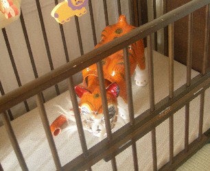 9ヶ月12日目()離乳食ネタに続き、今日2本目です。実は、今我が家に虎がいます義母が、兜と一緒に送ってきてくれたのです。主人の子供のころのものだそうです。息子が狙うので、ベビーベッドの中に入れてしまいました。ちょっとした動物園状態ですベビーベッドを揺らすと、虎の頭も揺れます。昨日お友達が来た時にコレを見て、びっくりしていました我が息子は最初この虎を見た時、おひげをむんずとつかみ、私に「こらっ」と怒られました。その後はこの虎が怖くなったらしく、虎の顔を見ると泣き叫ぶ・・・。そして数日後にはベビーベッドの中の虎を背後から襲い始めました。お尻側に回り込み、檻の外からまずはお尻をツンツン。で、次第に前から見ても泣かなくなりました。で、我が息子は昨日、この虎に餌をやっていました。どうやら餌付けを始めたようです。手に持っていたおしり拭きの袋を、虎の口元に持って行っていました。食べると思っているのでしょうか・・・昨日来てくれたお友達のとこのベビーは、我が息子の翌日に生まれた1日違いの子(=A君)と、2週間後に生まれた子(=B君)、どちらも男の子です。ママは、前にもちょっと書きましたが、関東弁のマシンガントークの方(B君ママ)、と、もう一人は私と同じ関西出身の方(A君ママ)です。ベビーは二人ともどちらかというとおっとりした男の子で、寝返りも5~6ヶ月くらいの頃。A君は最近つかまり立ちとズリバイをするようになりました。B君は、つかまり立ちもズリバイもしません。ほとんどお座りで、ちょっと離れたところにあるおもちゃは、お座りの状態で開脚して胸をべたっとついて手を伸ばして取ります。手が届かない場合は、諦めるか、お母さんを呼びます。この一連の動作がこれまたすっごくおっとりゆっくりしていて、うちの子のコマ送り動画を見ているようです・・・我が息子は3ヶ月と1週間で寝返りし、6ヶ月でつかまり立ちしたわんぱく坊主なので、将来気が合うのかどうかちょっと心配ですが・・・。我が息子が「ジャイアン」扱いされるのも無理はない・・・。しかし、息子が「ジャイアン」扱いされて、私も嬉しいわけではないです・・・。私も、「ジャイアンのママ」とか言われるし・・・・。でも、イヤな顔をするわけにもいかないし、一応笑って流しましたが・・・・。本当に心から笑って流せる大きな心が欲しい。。。。この二人の足の裏を見て、足の大きさが全然違うなぁと思っていたのですが、他のママ達もしばらくして思ったようです。「足大きいねーーー」と。明らかに我が息子だけひと周りデカイ・・・。そら、9ヶ月で歩くわな・・・とゆう感じさらにもうしばらくしてから、A君のママが、「うちの子の足が小さいのが気になってきた・・・。」と思い詰めたように言いました。やはり同月齢の子は特に比べちゃいますよね・・・。うちの子は落ちつきなくハイハイで走り回るので、なんだかこっちが申し訳ないくらいです。。。わんぱく坊主で「ジャイアン」扱いされてもイヤだし、おっとりして成長がゆっくりなのも、気になるし・・・。育児に悩みはつきものですね。あと1年か2年したら、こんな数ヶ月の違いなんて全然関係ないんだけどね。で、今度は言葉の成長を比べ合うのかなぁ。。。うちの子は遅そうだ・・・。どうやったら、おもちゃを「どうぞ」できるようになるのかなぁ。「どうぞ」はしないまでも、奪うのはやめて欲しいなぁ。まぁ、子供はそんなものだと思うけど・・・。(みんながみんなそうじゃないと思うけど、2歳半の男の子を持つ友人も、お友達を遊ばせる時間のうち9割はケンカしていると言っていました。)二人とも母乳はまだあげていて、添い乳もしているそうです。うちの子よりだいぶ歯が生えてきていて、おっぱいもよくかまれるようで、我が家に来た時もおっぱいをあげながら、何度も「イテテテ」と言っていました。一人は、おっぱいに穴まで開いちゃったらしく傷があるので、片側はあげられないと言っていました。ちなみに、A君は、ストローマグで飲むのがとってもとっても上手でした。うちの子はまだ吸い上げても「だら~~~~」っとこぼすことが多く、私はイライラしっぱなし。床にこぼれたお茶を手で広げて遊ぶもんだから、イライラ度は最高潮に達します。だからストローマグの練習も進みません・・・。B君は、吸い上げようとはせず、ブクブクと逆に息を吐くんだそうです。ストローの使い方もいろいろなんだなぁ。♪楽しい子育てブログがいっぱい♪1日1クリックしてね♪