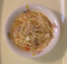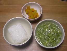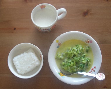 9ヶ月12日目()久しぶりにスカっと晴れましたしかしひきこもりだった・・・。息子は今日、3回ほど歩きましたといっても、2歩ずつです。前は、1歩踏み出して崩れ落ちる・・・という感じだったのですが、今日は1歩踏み出しても崩れ落ちることなく、さらに同じ方の足をもう1歩踏みだし、それでも崩れ落ちませんでした。そしてしばらくしてから、崩れ落ちる・・・。そんな感じです。よちよち歩く姿はかわいいです今日は歩く姿を動画に撮れちゃいましたさて、今日の離乳食。【1回目】(午前7:30)・トーストをちぎったもの(1/2枚分)最近トーストが食べづらいのか、喜んで食べてくれませんでした。今日もちょっと乗り気じゃなかったみたいですが、今までは1cm角くらいに切ってあげていたのを、さらに細かくちぎってからエプロンのポケットに入れてあげると、自分で全部おとなしく食べてくれました。トーストをもっと喜んで食べれるようになると、朝食が楽になるのだけど。・バナナヨーグルト(バナナ1本、ヨーグルト大さじ3位)バナナ、朝から1本もお召し上がりになりました。最初から1本食べさせるつもりだったわけじゃありません・・・。まず1/3本分のバナナを5mm角くらいに切ってお皿に盛り、上からヨーグルトをかけました。で、スプーンで「あ~ん」と前から食べさせてあげました。パクパクと完食。もう無くなったとわかると、「びえ~~ん」。「はいはい、おかわりね」と、さらに1/3本分のバナナを切ってヨーグルトをかけて、「パクパク」。完売御礼そして再び、びえ~~~ん「え???まだ食べる気かいはいはい・・・」と、バナナ1本分完食・・・。そして、ミルクも哺乳びんで180ml飲み干す。トーストとバナナヨーグルトでは足りないらしい・・・。やはり、夜のおっぱい(添い乳)をやめて以来、よく食べるなぁ。【2回目】(12:00)・全がゆ(冷凍ストック)・春キャベツとブロッコリーのチーズ煮春キャベツ(生)とブロッコリー(ゆでて冷凍しておいたもの)を粗みじん切りし、沸騰したお湯で柔らかくなるまで煮る。柔らかくなったらベビーコンソメを少々入れ、ピザ用チーズを入れ、さらに加熱。・ミルク100mlピザ用チーズは冷めると固くなるのであまり離乳食には適さない気もする。普通のチーズの方がいいらしいし普通のチーズもあったのだけど、間違えて入れてしまった。今日も、前から「あ~ん」と食べさせるのではなく、背後から一緒にスプーンを持って食べさせる介助方式?で食べさせました。チーズがやはり固かったようで、半分くらい食べたところでぐずりだす。そこで、前から「あ~ん」と食べさせる方法に変更し、なんとかだいたい食べました。でも、おかゆ1/3位残りました。ミルクも1/3飲んで、あとは拒否。あらそう。お腹減っても知らないんだから【おやつ】(16:00)・海の幸チップス1袋一旦口の中に入れてなめ回したものを、手にとってねちょねちょし、再び口に入れる・・・。こんな不思議な行動を繰り返しておりました。。。汚いんですけどぉ・・・【3回目】(18:00)・そうめん【材料】そうめん1/2束、鶏肉だんご(冷凍)、豆腐・にんじん・春キャベツ・ねぎ・酒・みりん・しょうゆちょっと手抜きの夕食です・・・。そうめんをゆでるまえにまな板の上で2cmくらいの長さに包丁で切りました。前回そうめんをあげた時は、大人のそうめんと一緒にゆでてから子供用を取り分け、まな板の上で切ったのですが、ちょっと切りにくかったし、今日は大人用のそうめんは必要ないので、最初から切ってしまいました。で、切ったそうめんをお湯で数分煮てざるにあげる。再び小鍋にお湯をわかし、まず春キャベツを煮る。柔らかくなったら豆腐を入れる。ちなみに、今日の豆腐とにんじんは、大人の朝食のみそ汁の残り物・・・。ほんの少し残っていたのを、汁は捨てて具(豆腐とにんじん)だけを取り分け、そうめんに入れてしまいましたまぁ、夏じゃないし加熱するから、大丈夫かなぁ。。。かなりアバウトな今日この頃ですで、野菜と豆腐に十分火が通ったら、ゆでておいたそうめんを入れ、酒・みりん・しょうゆでうす~~~~く味付け。片栗粉でとろみをつけてもよかったのですが、今日はつけませんでした。介助方式で食べさせるようになってから、別にあまりとろみをつけるメリットを感じなくなりました。とろみをつけても、スプーンについた唾液でしばらくしたらとろみ無くなっちゃうし・・・。(以前、「探偵ナイトスクープ」で、八宝菜のとろみが食べている間に無くなる人と無くならない人がいるというネタがありましたね。とろみが無くなっちゃう人は、スプーンをねぶり八宝菜をかき回してから食べており、その間に酵素かなんかの働きで、とろみがなくなっちゃうんだとか。だったかな)介助方式でおとなしく完食。お皿にすべて盛ることができずお鍋に残っていたので、この写真の量の1.5倍を食べました。でも、そうめんだしね。生後9ヶ月で介助方式で食べさせるのは早いのかなぁ。でも、こ