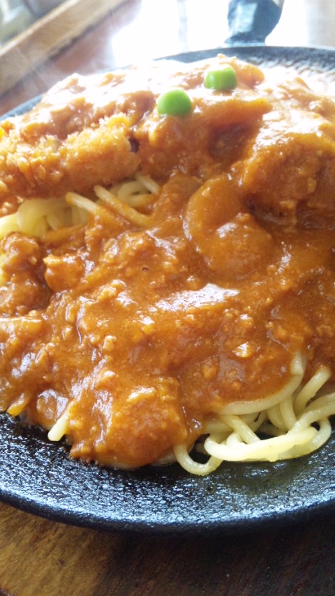 スパゲティーミートソースの上にカツが乗っています。