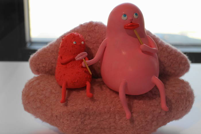 また、小さなクリアボックスには、たらこくちびるにちょこんと座った生き物(?)が、たらこ唇を交換しています。なんてシュールなんでしょう!
