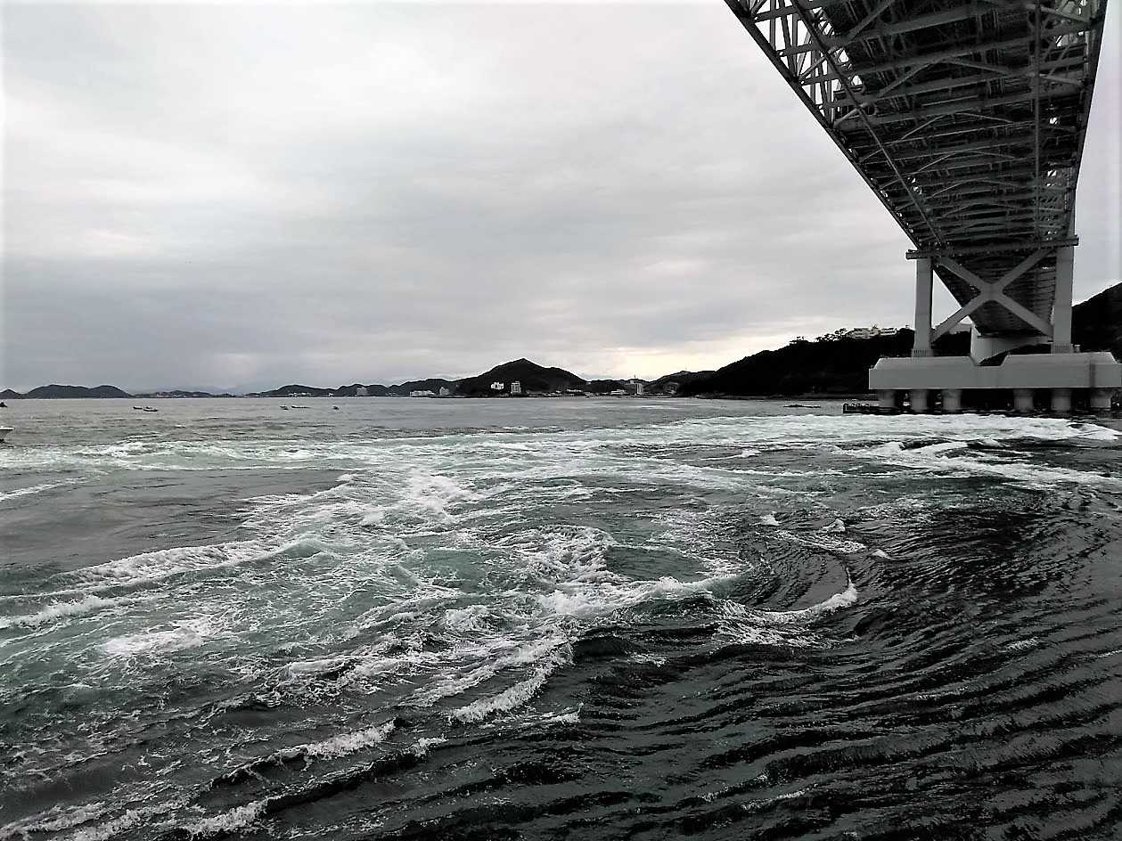 心配してた雨も上がり、鳴門海峡のうずしおが観れました。ちょうど満月の大潮らしく、海峡を渡る海流差が大きくてタイムリーでした。