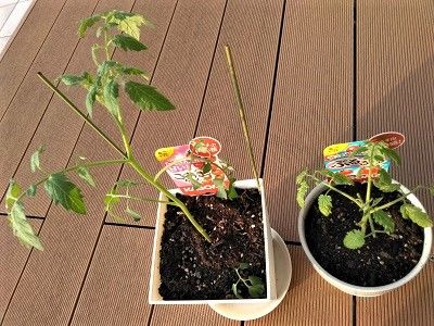 大笑いバルコニーのプチ菜園、スイートバジル、豆苗に続いてプチトマト収穫できそう楽しみ。