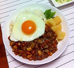 大豆たっぷり!健康キーマカレー☆料理名:キーマカレー作者: も る す け■材料(2人分)合挽肉 / 100g前後大豆(水煮) / 1袋玉葱 / 小1個人参 / 1/2本しめじ / 1/3袋生姜(あれば) / 1カケガラムマサラ(カレー粉でも) / お好みでカレールー(市販) / 2皿分(2カケ)水 / 100ml醤油 / 小さじ1卵(目玉焼き) / 2個じゃがいも・モロッコインゲン / お好みで■レシピを考えた人のコメント煮込み時間ほんのちょっとで、スピーディに完成するカレー♪大豆たっぷりでより健康的に・・・。詳細を楽天レシピで見る→