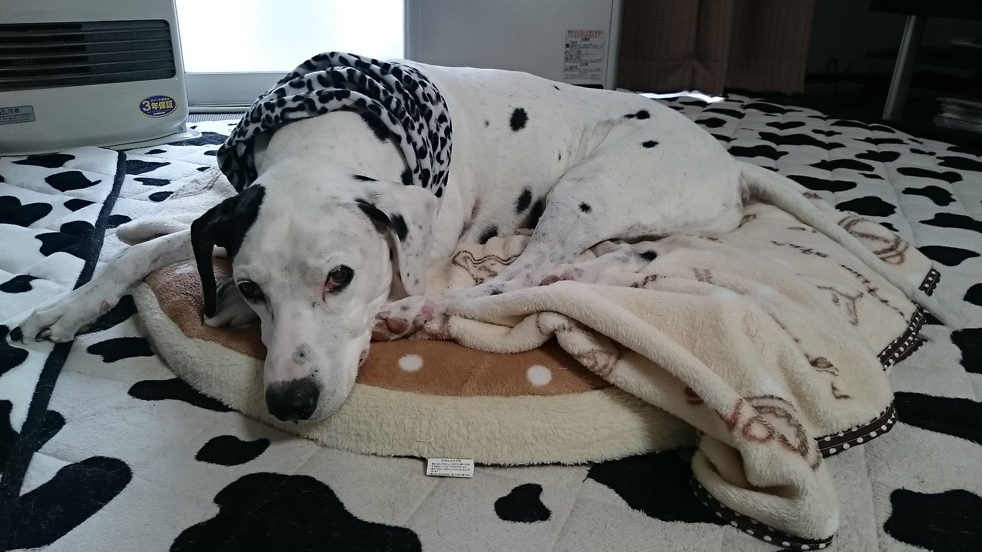 去年、書けなかったので記録用に書いておきます。2016/12/24からのきよし&ふじこ前日(12/23祝)にアリスママのお店で4ヶ月ぶりにシャンプーしてもらったきよしシャンプー後の体調もそれほど悪くなかったです。鎮痛剤は12/23に飲んだ後12/27まで飲まずに過ごせたしこの日の午前中のお散歩。シャンプーしてもらったからリードに可愛いリボンつけてもらってこの日は靴を履かずに歩きました。動画にも撮ったので見てね。 ちなみにふじこには、こんな感じで見送られましたふじこもきよし同様、前日にシャンプーされたのて疲れちゃった・・・かなクリスマス・イブのこの日パパは仕事だったのでミヨミヨはお昼寝しようとしたけど、しばらくして身動き取れず苦しくなって起きたらで、狭っっきよし&ふじこにギューギュー押されてたみたいで、とてもこの間では寝れずお昼寝断念そんなことはお構いナシに爆睡するきよし&ふこでしたが布団の中は更に密集しておりました~普段は、こんな風に引っ付いて寝たりしないのにね。嫌がらせやわ~(笑)そして翌12/25(日)この日はみんなで朝のお散歩歩いている感じをパパが撮ってくれました。きよし、力強く歩けています 鎮痛剤を飲まずに2日すごす事ができました。翌12/26(月)平日は動きまちぇん平日は更に動かなくなるふじこを残しきよしは朝の散歩へ。靴を履かずに数日間、散歩に行きました。きよしも力強く歩いていましたがやっぱりちょっと疲れちゃったかな。そして翌12/27(火)この日は雨雨の日は行きまちぇん・・・わかってます(笑)そんなふじこを置いてきよしは雨でも散歩に行きました。雨だと帰ってきたら顔が濡れて、ちょっと別犬みたいになっちゃうんだよね雨も降って体が冷えたのか、少し体調がいまいちっぽかったので4日ぶりに鎮痛剤を飲みました。そして翌12/28(水)この日までミヨミヨもパパもお仕事。きよしは蘭ちゃんママさんが作って下さったコートを着てお散歩しました。鎮痛剤はこの日も飲みました。パパがいないと散歩に行かない、外に出ない、不思議ちゃんふじこは元気です出かけるときに毛布を掛けてあげたら、帰ってきてもこのままでした(笑)全く動いてないっぽい・・・完全に平日は体力温存しています年末に向けて寒さが和らいで、きよし的には少しは良かったのかな。この後、お正月はすっごく寒くて大変でしたが・・・続きます。ポチっとしてもらえると嬉しいですにほんブログ村