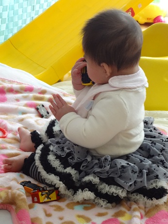 リトルモモ楽天市場店で購入したpanpantutuのスカートが届きましたSサイズ(0~2才)を履かせて初の着画ミニカーしゃぶってます…かなりのボリュームです。少し大きいかな?SとMだとこれだけ大きさが違います。おまけにヘアゴムがそれぞれ付いてました。手作り感たっぷりの(笑)