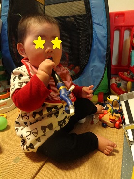 長男の遊ばなくなった戦隊物の人形をしゃぶってますBUZZFUZZ<バズファズ>楽天市場店さんで買ったBEBEのワンピースにGAPのロンパースとanyFAMのスパッツを合わせてます。スタイはファミリアです。