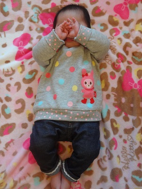 あかちゃんぱぁくさんからスーパーSALEで購入した商品が届きましたB子ちゃんのスパッツ、90を買ったのですが8分丈なので長女にはかせてみると、足首を少し出るくらいで今から履けそうです。(7ヶ月、身長66cm)こっちは起きてる時に撮りました。手作りのヘアクリップです次男の足が…こちらを参考にしました