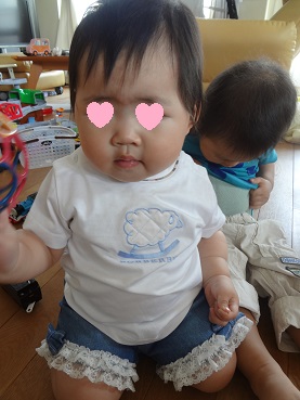 長女の予防接種に出かけようと思ってましたが、長女がお昼寝してしまったし、雨も降ってきたので延期明日の午前にでも行こうかな。今日の長女のお洋服、甥っ子ちゃん(実妹の子)からのお下がりのバーバーリーTシャツに去年のセールで買ったメゾピアノのショートパンツを合わせてみました。なぜか次男はTシャツ捲って、自分のお腹見てます(笑)Tシャツは実母からプレゼントしてもらった物だそうで(珍しい)、次男に去年着せようと思ったのですが、小さめの80だったので着せずに長女まで取っておきました。もうすぐ11ヶ月の長女に今ジャストサイズです。よだれが少ない日だったのでスタイなしで過ごせました。このまま減ってくれたらいいのに…メゾのショートパンツ、今年も同じような感じの物が販売されていますね。セールになったら来年用が欲しいな~