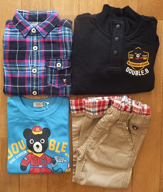 ベビー&チャイルド ダイワさんからダブルB1万円福袋が届きました我が家にも非固定版がやってきました大満足ですハイネックトレーナー(福袋用)お胸にDBの文字がないパターンです。厚手で首元まで暖かそう。ダブルガーゼシャツ、100のネタバレがレッドだったでブルー狙いで110にしたんです!ブルーにピンクのライン、すごっく好みアルバイトロンTはハンバーガー柄の白い方が好みでしたが、ガゾリンスタンド柄もカッコイイです!シャツがブルーなのでコーデできそうだし。ベージュのパンツは薄手です。こちらも福袋用かな?合わせやすいお色なので嬉しいです。計4点で31290円でした!2万円袋は男女共全サイズ揃ってますね。