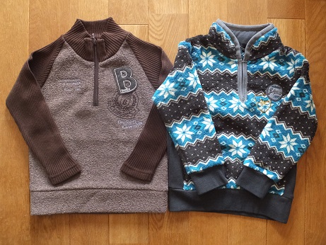 楽天NARUMIYA ONLINE(ナルミヤ)さんで購入した分が届きましたサイズ100です。どっちも可愛いただ、どちらも薄手です…アイボリーは店舗で実物確認済みだったのですが、黒はさらに薄い!なのに刺繍が毛糸って(苦笑)黒はもこもこのウサギ耳がフードについてますが、フードは苦手なので取り外して着せようかな。手触りだけ楽しみます(笑)長男にブルークロスのトレーナーとセーター130です。クレードスコープのダウンジャケットと着丈は一緒でしたが、袖は長かったです!来年用のつもりで買ったので、よかった~!!