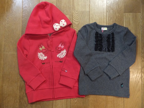 BEBEに続きましてKPでもお買い物店舗でじっくり商品を眺めたの初です(笑)90・95のセール品の中から好みのものを掻き集めました。一番気に入った赤いパーカーは95です。キッズ ピピさんで色違いは見かけましたが、赤もあったんですね!KPぽくないお色?薄手のトレーナーは90。まるでBEBEのようなデザインに惹かれました迷いに迷って買ってしまった2点!両方とも90です。勢いです(苦笑)今季はメゾが好みの物が少ないのでKPに手を出してしまいました。嵌りそうです