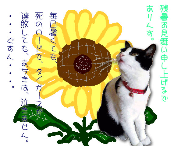 残暑お見舞いでざんしょ☆お暑うございます。しかしながら、ちょっと心を鎮め、肌に触れる風を感じてみると、どことなく、遠くから秋の気配が察知できます。明日から私、夏季休暇をとらさせていただきます。野田にあるお墓に行き、ご先祖様をいざない、牛丼屋に寄った後、標ない旅に出ようと思っております。休みの間の小さな旅ですが、一匹でも多くの猫と触れ合え、心の交流を交わせればと期待しております。なので、その間、日頃よりお世話になっている皆様方のところへ訪問できなくなってしまいます。来週帰ってきたら、お土産をもって、皆様のブログを訪問させていただきます。まだまだ暑い日が続くと思いますが、皆様、どうか熱中症などに気をつけ、夏バテなどせぬよう、ご自愛ください。そして、有意義で想い出に残る夏休みをお過ごしください。生のみみずや道端の白菜、とうもろこしの芯など・・・いくら美味しそうだからと言って、決して拾って食べてはいけませんよ。お腹をこわしたら、絵日記が書けなくなってしまいますからね。ではでは、また来週お会いいたしましょう☆