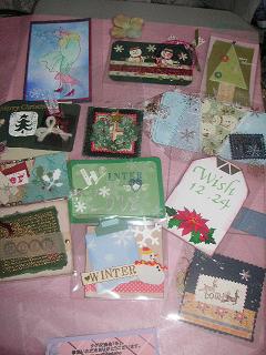 残りのカード&タグが25日の朝、届いてました~♪実は部屋の片付けを23日から始めたので、あまり広げたり出したり出来ずで、とりあえず急いで写真だけはとりました。可愛らしいラッピングなどもゆっくり開けたかったので、袋のまま失礼します(~_~;)まずは、はなはなさんのタグ交換会ですわかりづらいですが、どれもすっごく可愛いクリスマスタグでした~私はこちらを送らせていただきました。みなさんのがあまりに手が込んでいたので、すごくシンプルに見えて仕方なかったです。そしてroroさんのところの月タグ&カードです。12ヶ月のタグたち~自分がその月を担当してたら、思いつかないであろうアイデア満載のタグばっかりそれに、roroさんからのミニブックのプレゼントが!!私の好きなオレンジとお花がすっごく可愛らしい~♪ありがとうございました。私は2月です。バレンタインをイメージ。中は分解できます。カードもクリスマスカラー満載で、すっごい素敵♪これはどうなってるんだろうとか、このスタンプはとか、いろいろ気になるんですが、こちらもゆっくり見させていただくのはもう少し後になりそうです(~_~;)私は猫ちゃんサンタです(笑)このスタンプ使いたかっただけなんです。そして、FrescaさんのATC交換会初めて参加、初めて作ったATCなるもの。スタンプを使って~なんですが、色んなサイト見て学習するも、ますます混乱状態届いたATCは、やっぱり生で見ると「すばらしいスタンプ使い」のものばかりでした。そして、私が迷いながら作ったATCです。使ったスタンプは一つです。これを一人ずつスタンプし、さらに全部違うものにしてみました。みなさん、どれが届きましたか?交換会はこれで全部届いたかな?もう何が何やらです(@_@;)交換してくださったみなさま、ありがとうございました。お礼に伺うのは少し遅くなるかもしれません~。頂いたカードやタグは大切にしますね~。そんな最中、部屋の掃除=模様替えを始めたものですから、もうワケわからん状態で写真撮りました。部屋は微妙に片付いてきましたが、まだまだ・・・とりあえずSBグッズは先にやらないと1月からの作品作れないんで・・・フラワーを瓶から出しました。あの瓶が可愛くて買ったけど、結局邪魔モノ・・・これでずいぶん場所を確保出来ました。棚一つは片付きました(>_