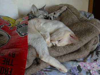 来週からプール開きです。私は幼稚園の頃からプールが大嫌いだったんです。なので、今年も嫌な気分です。でも頑張るぞー!今日学校から帰ってくると、チョロもハナミも寝ていてヴィトンだけが起きていました。私がベットに戻って録画していた「新キッズウォ-」を見ていたらヴィトンが鳴いてやってきました。そして、撫でてやるとゴロゴロ鳴いてくれましたv可愛かったですv