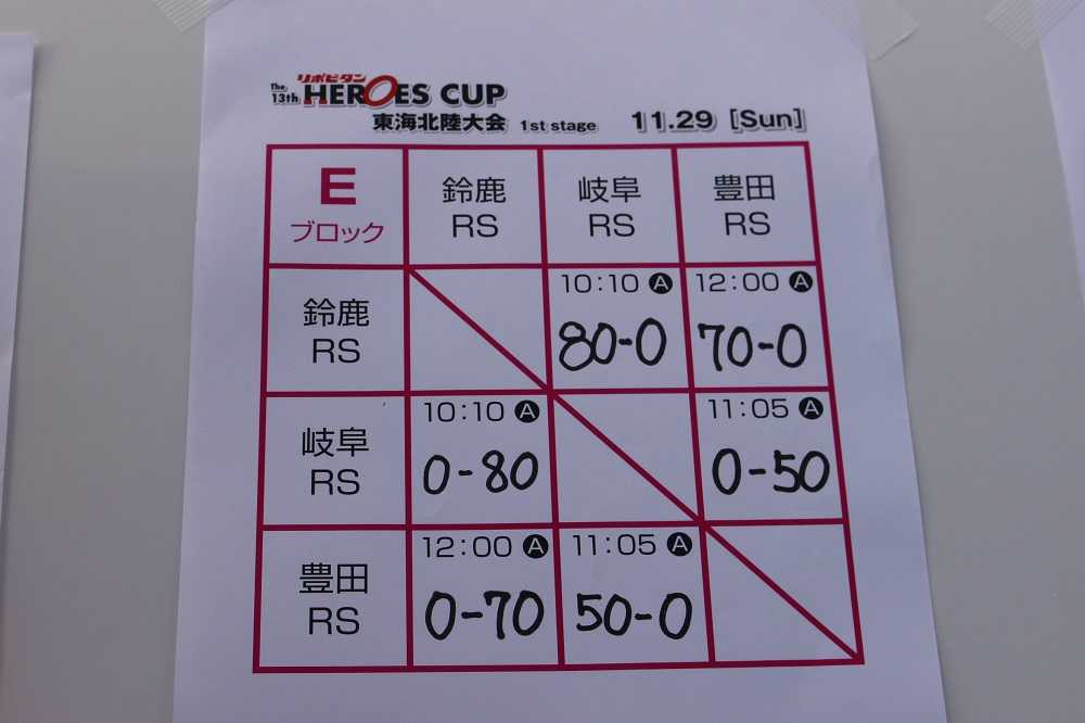 11月29日ヒーローズカップ東海北陸大会1stステージEブロック1位2ndステージ 進出全力で戦ってくれた子供たちに全力でチームのサポートをしてくれた子供たちに感謝。対戦して頂いた岐阜RS,豊田RSの皆さまに感謝。対応頂いたコーチ、レフリー、遠方遠征に応じて頂いた保護者皆さまに感謝。そしてなによりの感謝を、ヒーローズカップ開催にご尽力頂いた皆さまに。子供たちに「夢」「希望」「思い出」をと。このご時世の中、覚悟と信念を持って開催して頂きました。本当にありがとうございました<(_ _)>2ndステージも、皆さまの思いを胸に全力で戦います。