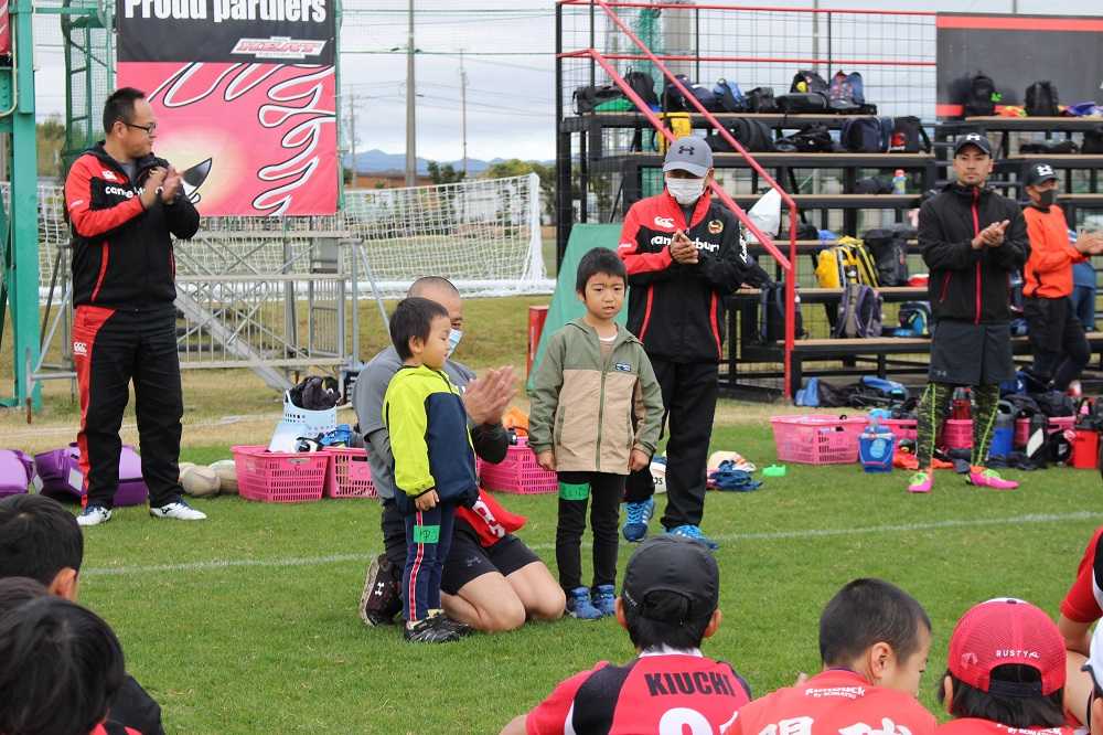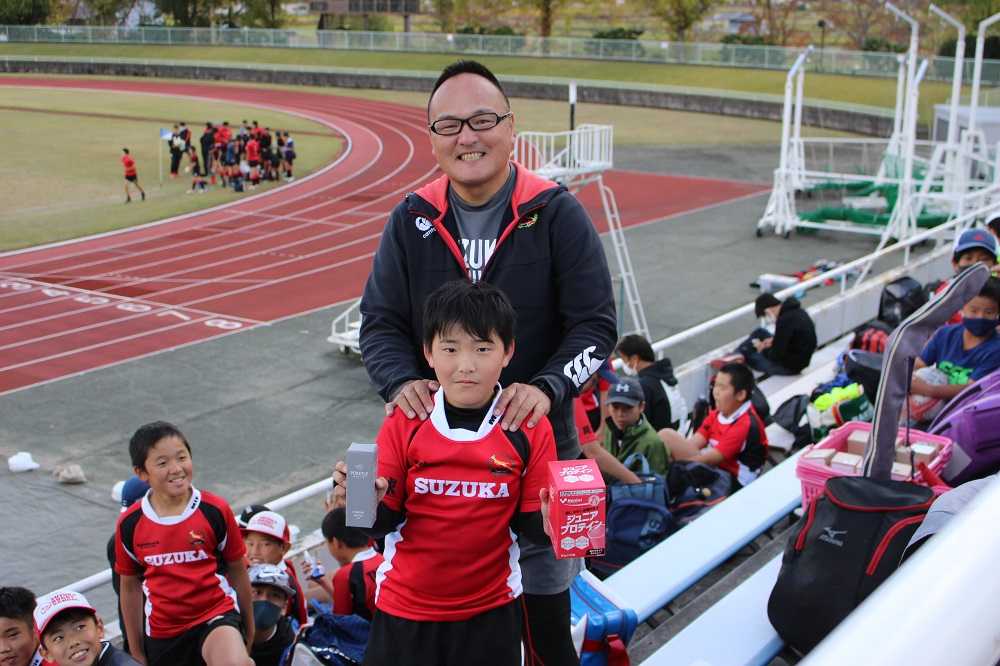 11月3日ONETASTE交流大会奮闘 編参加スクールアウル洛南JrRFC 高槻RS 関RS 伏見クラブミニ 八尾RS 洛西RS 野洲RS 鈴鹿RS各スクール選手コーチ関係者の皆さま、そしてなにより、このような状況下の中、交流大会開催にこぎつけて頂きました大会事務局の皆さま、素敵な交流大会をありがとうございました。コロナ禍での県外遠征は当然リスクを伴う。しかしながら、子供たちがこれから大舞台に挑もうとするなら、我々大人は最大限の準備をしてあげたい。本交流大会への参加も非常に悩みましたが、これも本番に向けた大切な準備として踏み切りました。朝早く起き、しっかり朝食を食べ、移動し、試合に向けて準備する。こんなルーティーンを経験するのも然るべき準備なんです。子供たちが不安なく、自信をもって本番のピッチに立てるように。では、交流大会の模様です。まずは本交流大会MVPの紹介InK!まだまだラグビー経験は浅い。ラインブレイク出来るような目立つプレイヤーでもない。大きくもない。しかし、よく体を張る。よく動く働く。縁の下にこうしたプレイヤーがいるから走れるプレイヤーが出てくるんですね。大会事務局さまから素敵な副賞も頂きました(^^)では交流大会の模様です。この日のPhotoはSgJコーチ。色々な方々の支えのもと鈴鹿RSの活動は成り立ってます。感謝。