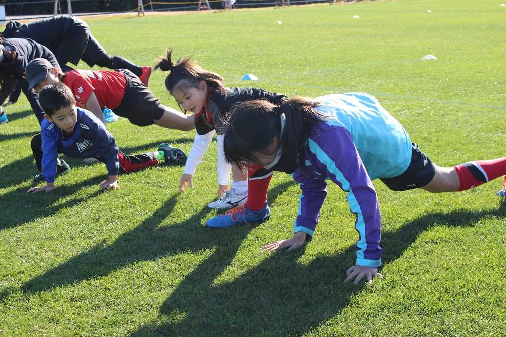 中学生含めた上級生と、幼児含めた下級生がペアになりウォーミングアップ。