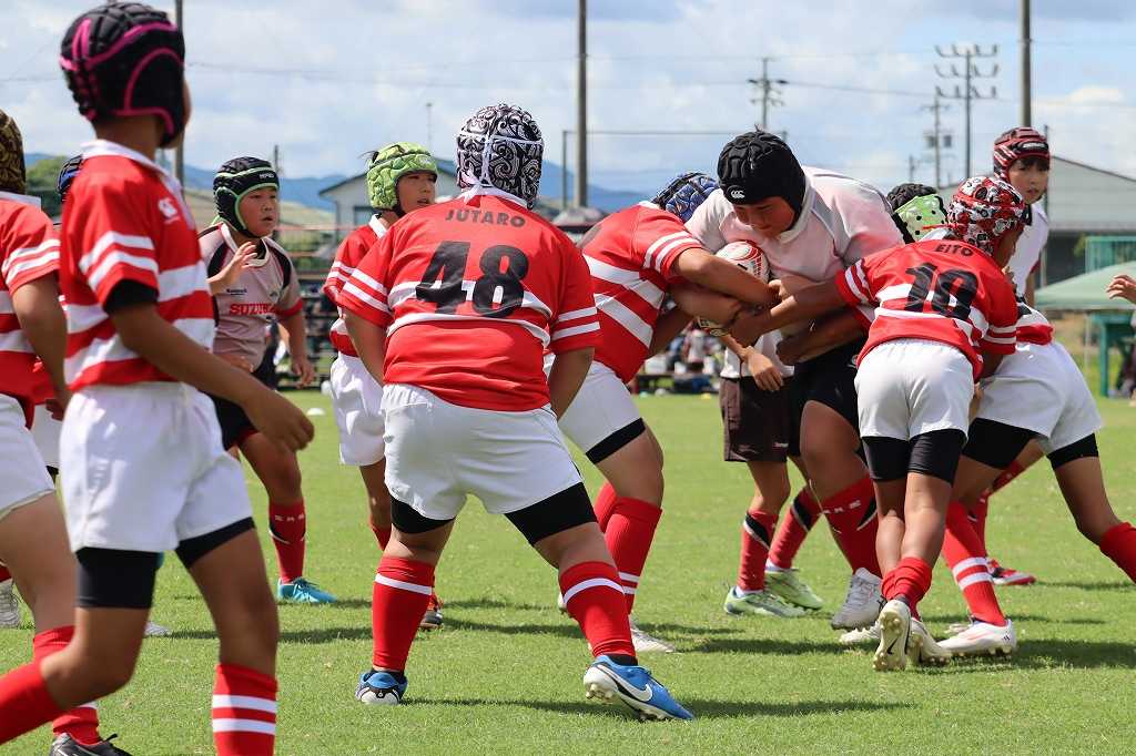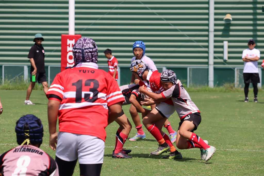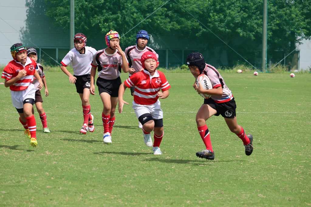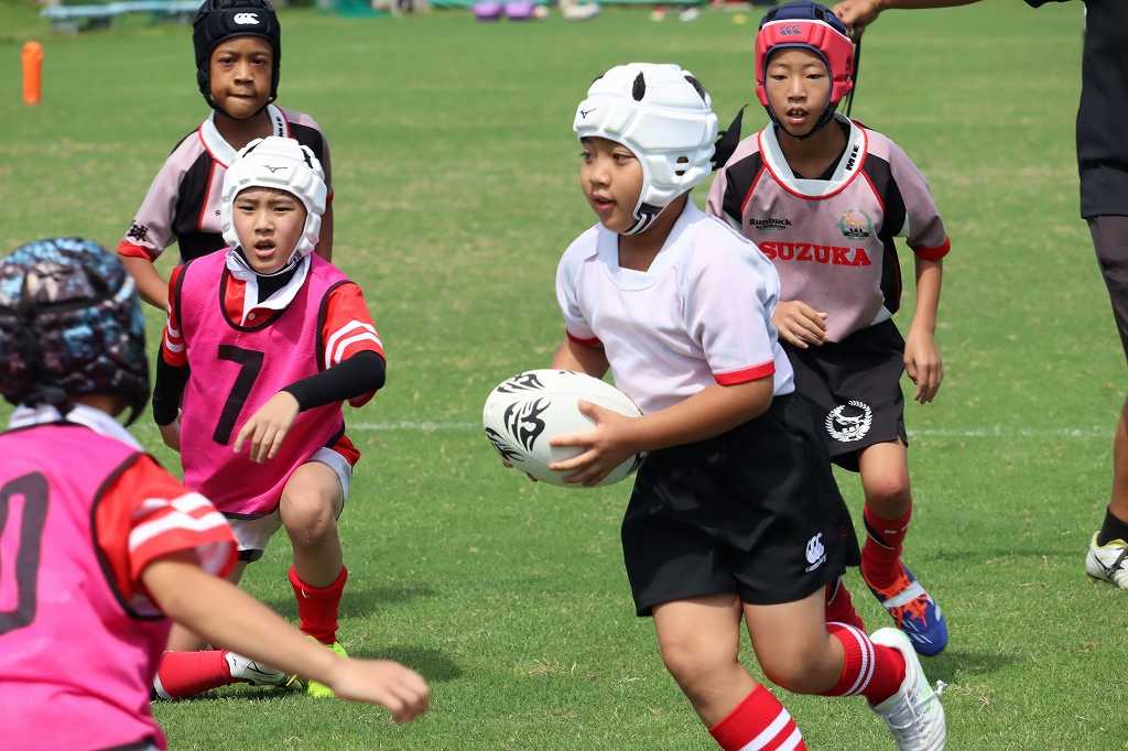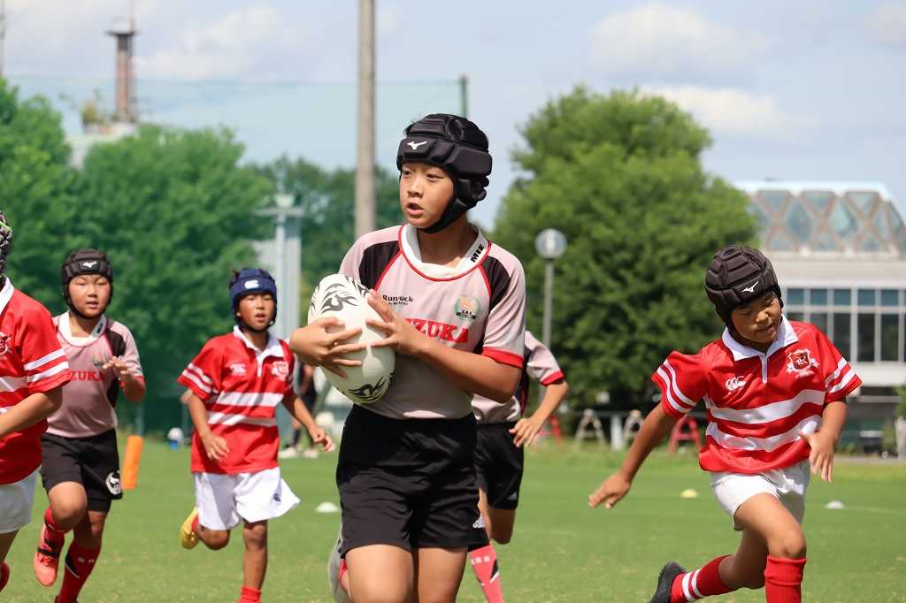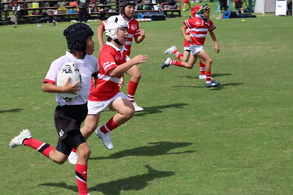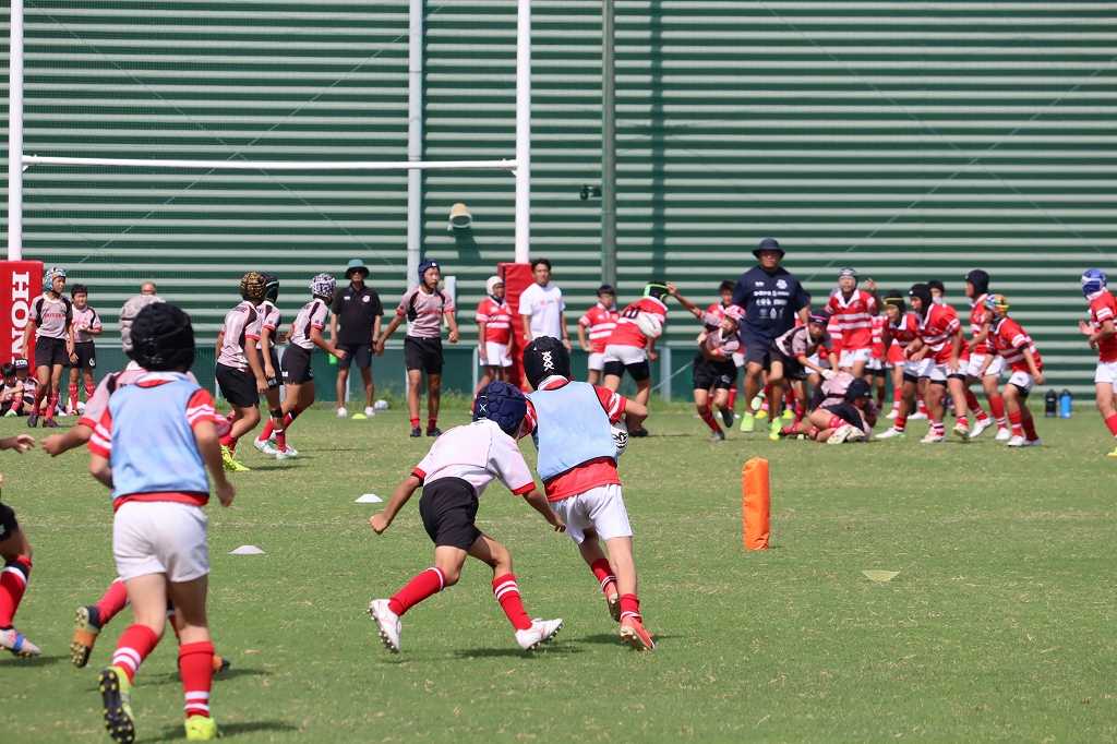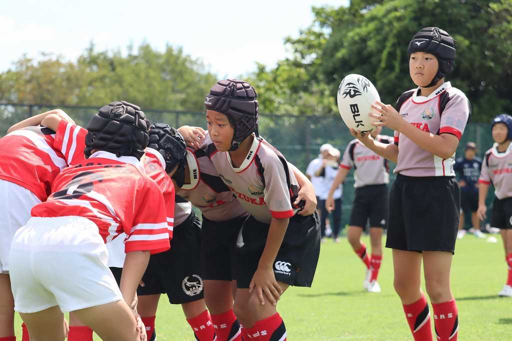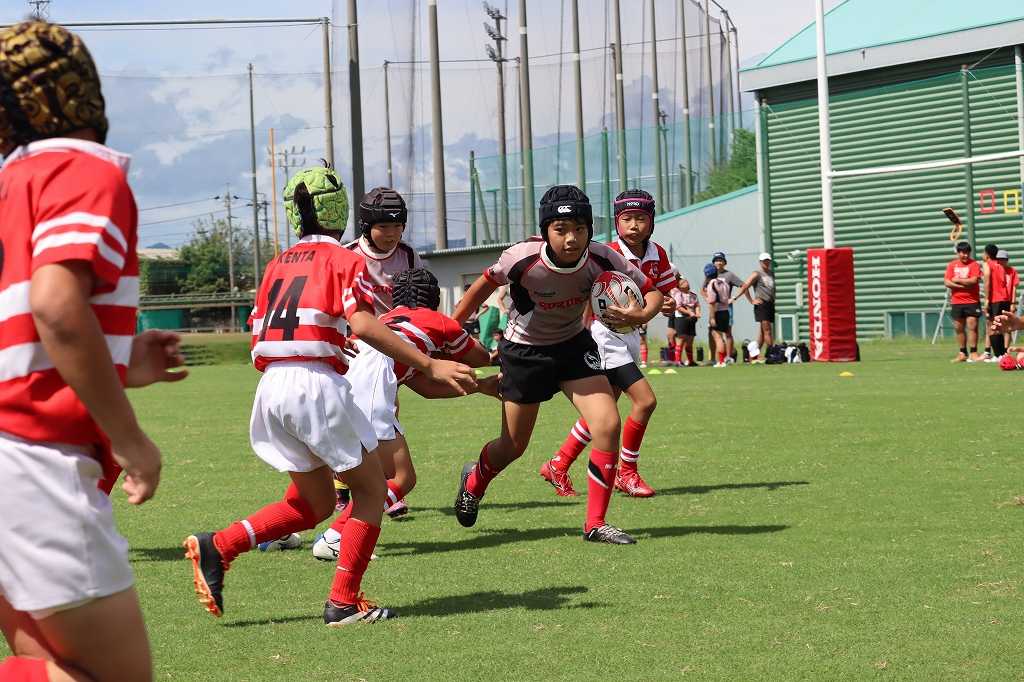 グラウンドいっぱいに ラグビーに励む両チームの子供たち。