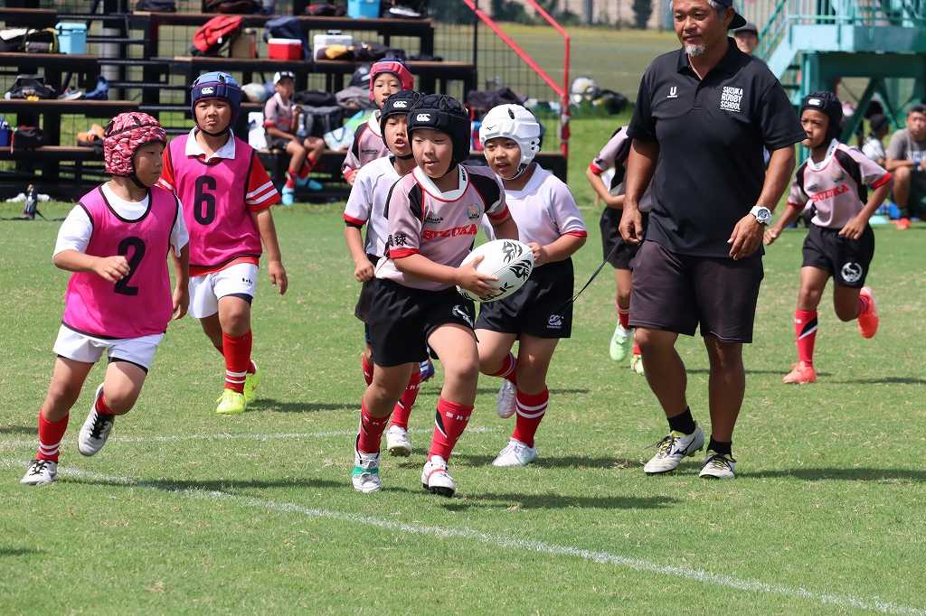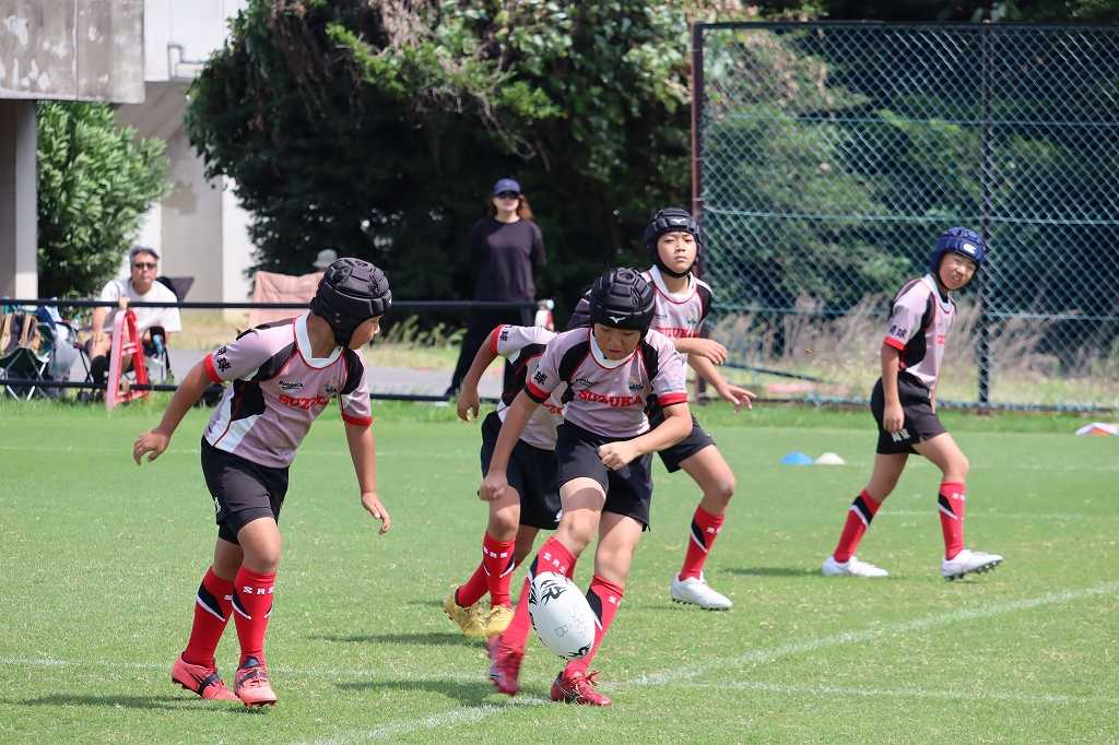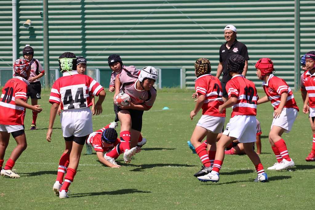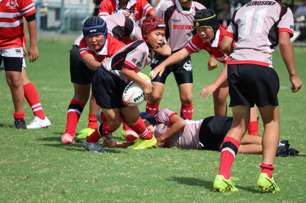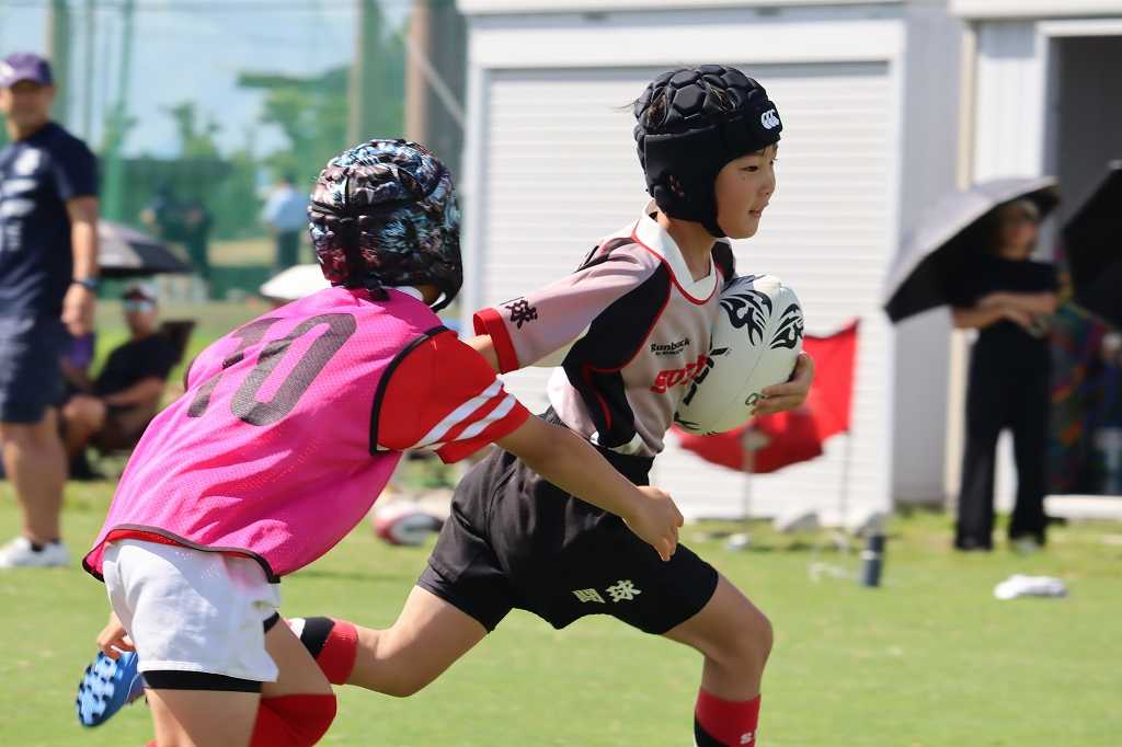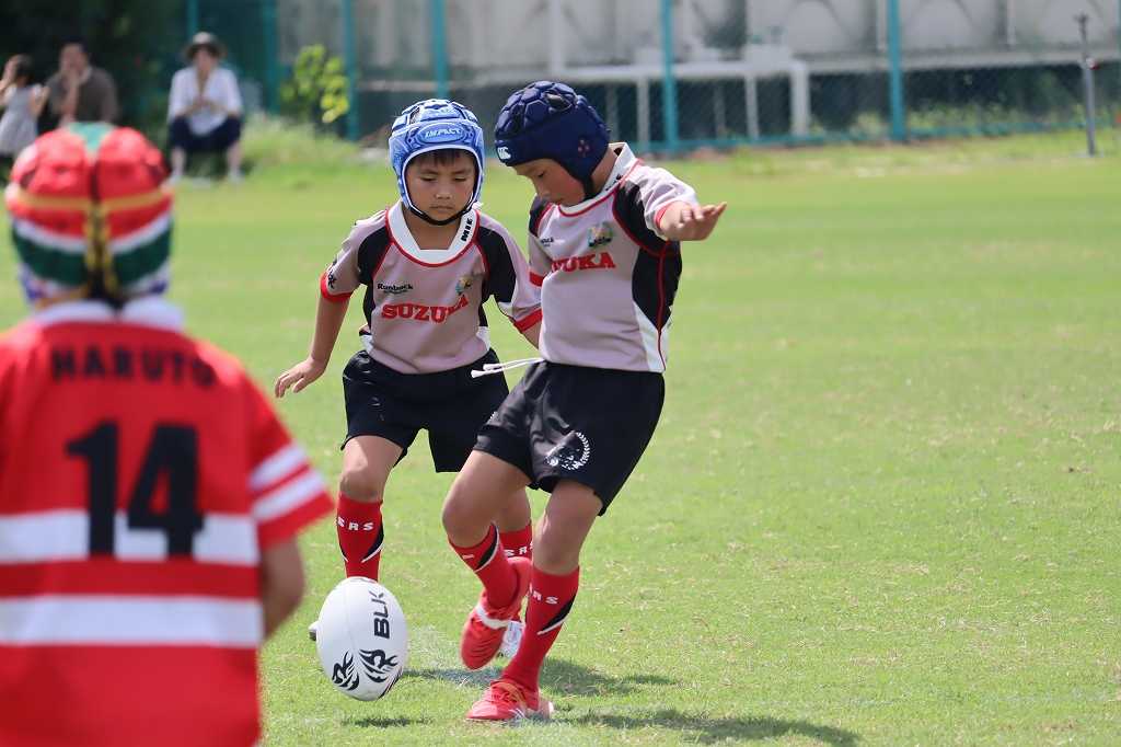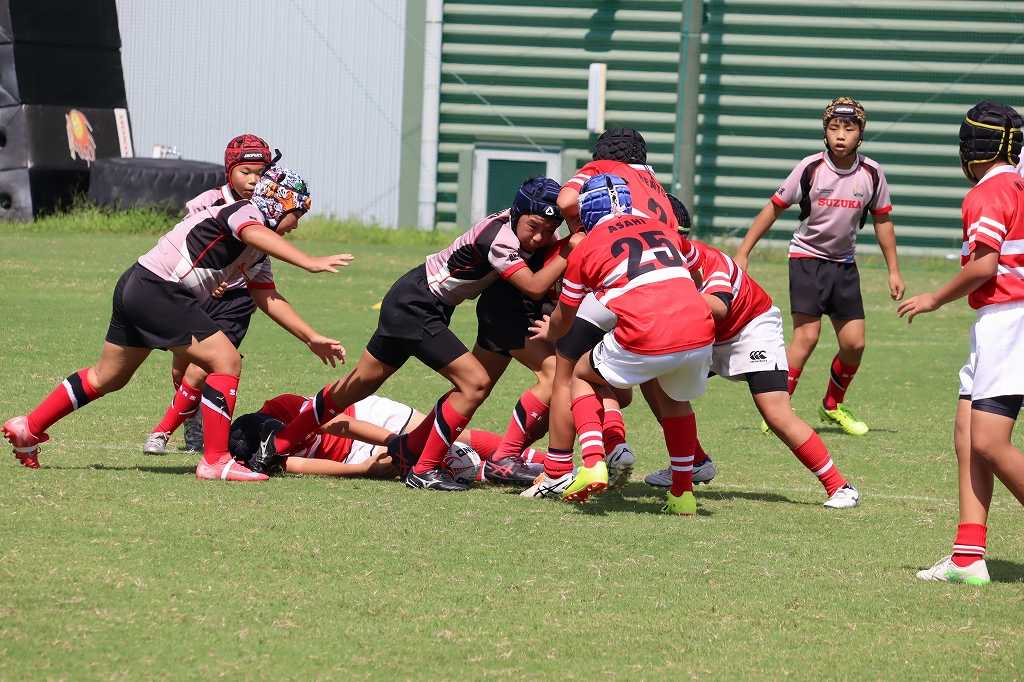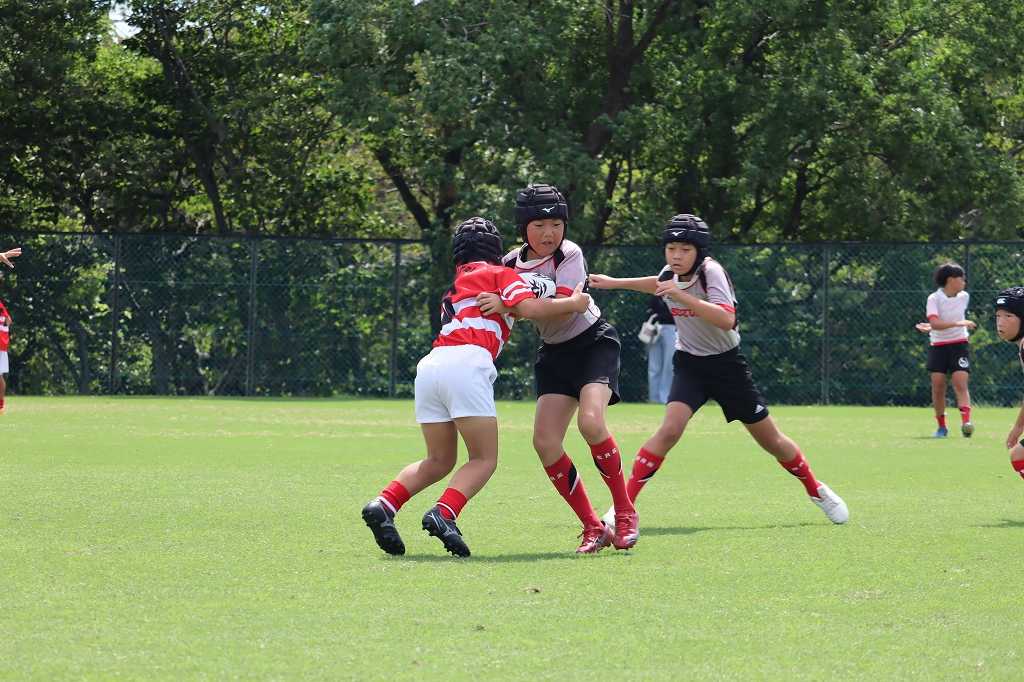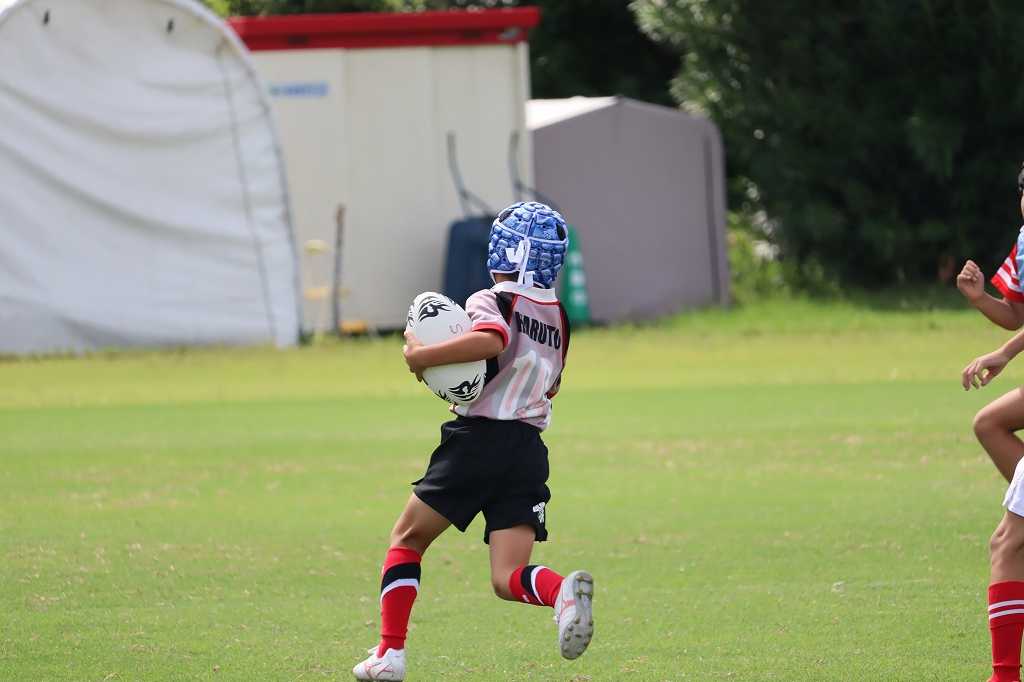グラウンドいっぱいに ラグビーに励む両チームの子供たち。