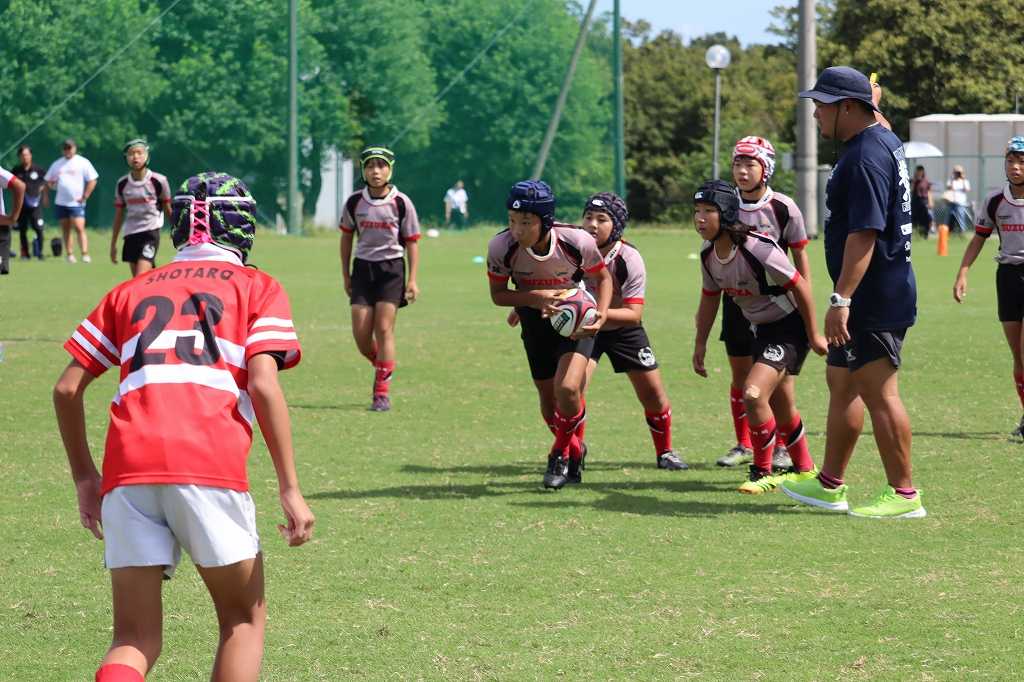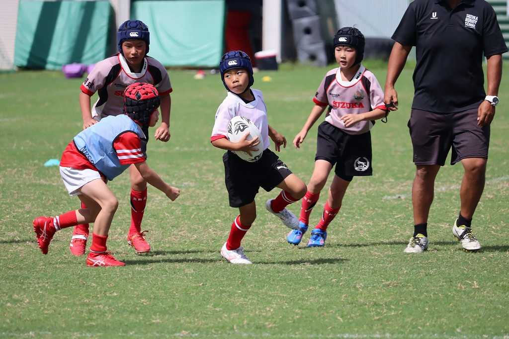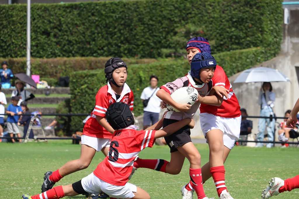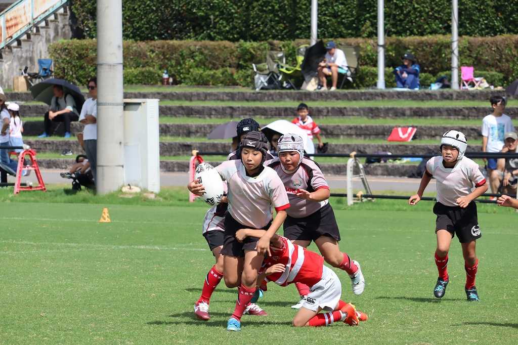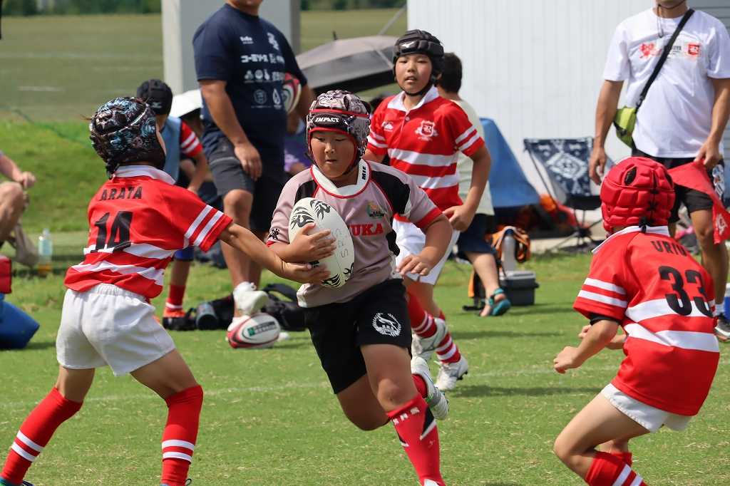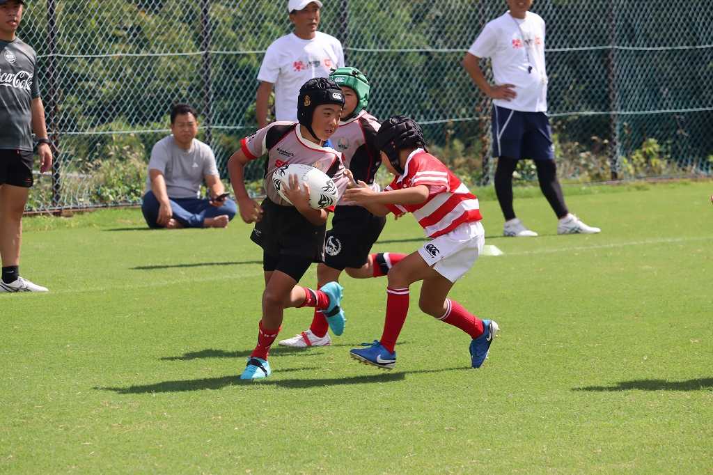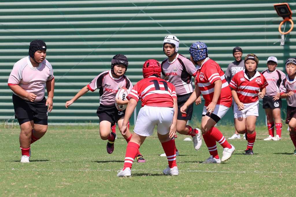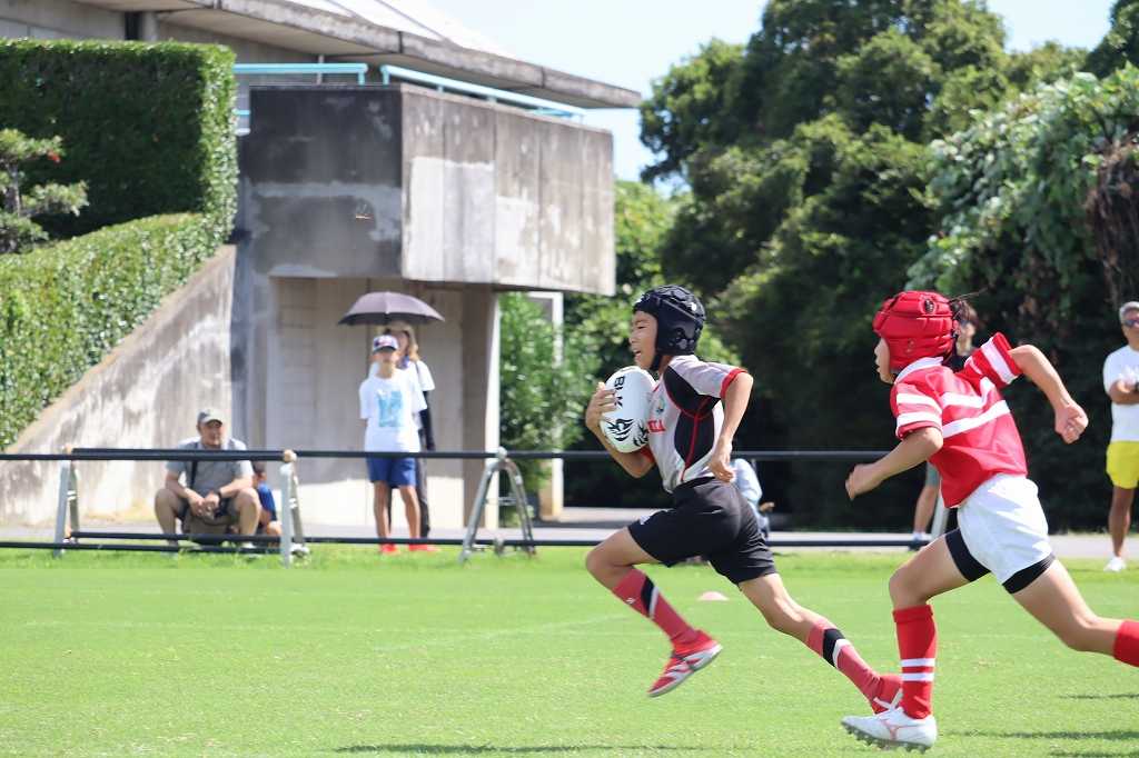 グラウンドいっぱいに ラグビーに励む両チームの子供たち。