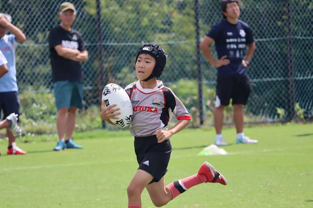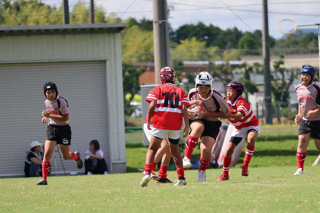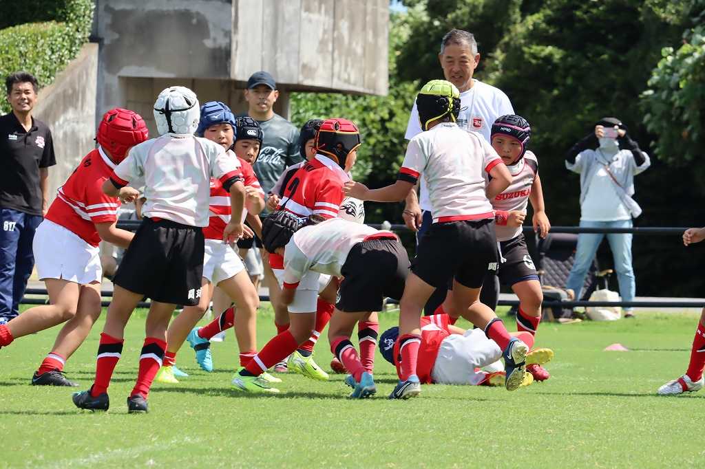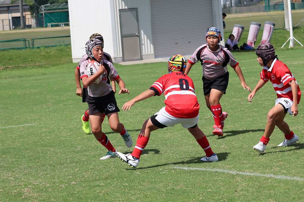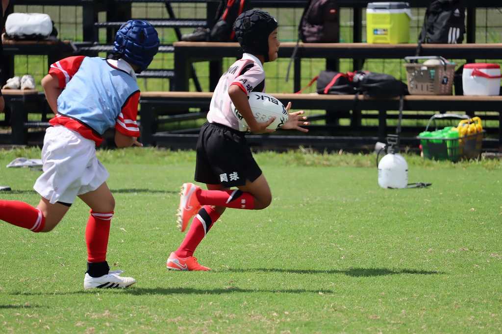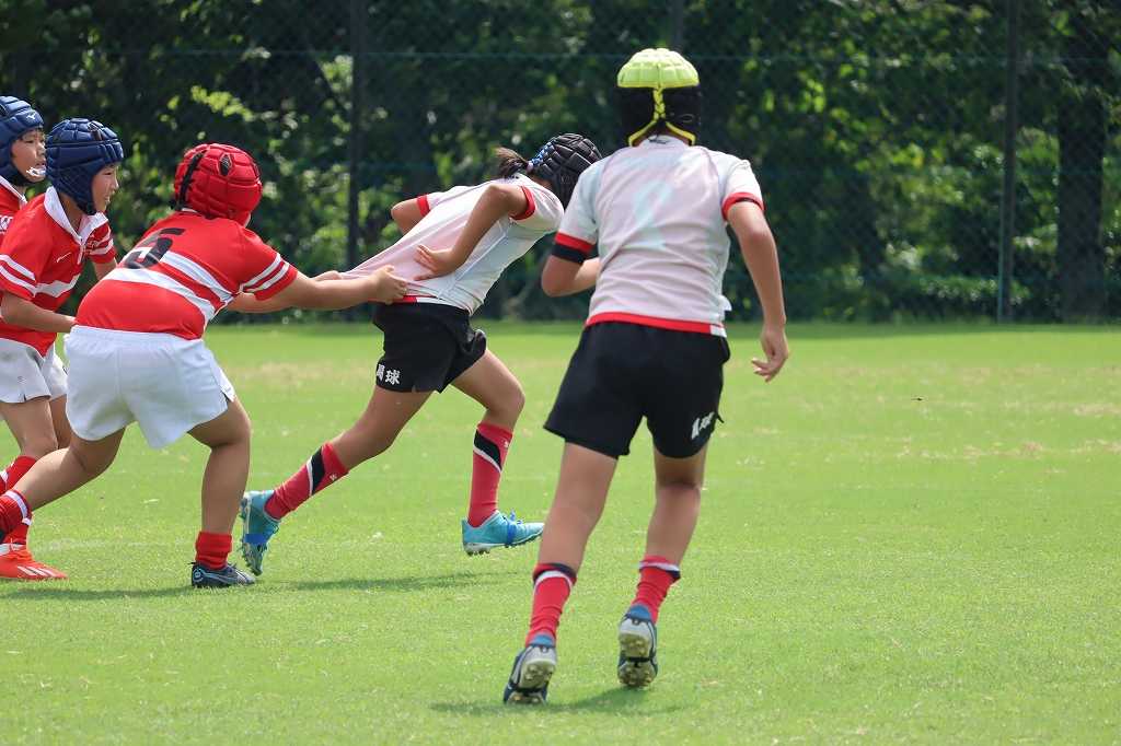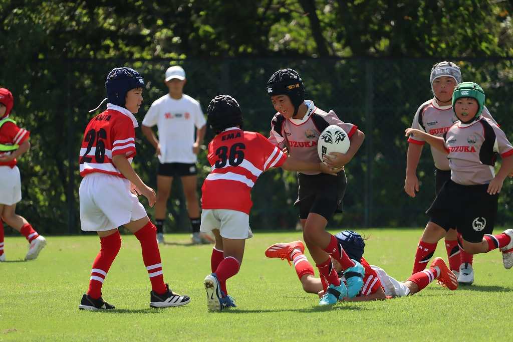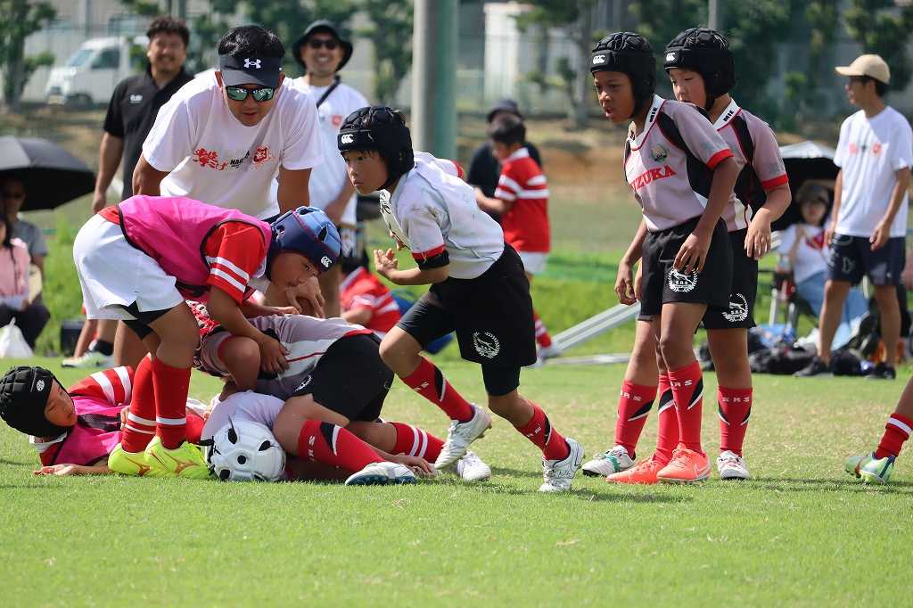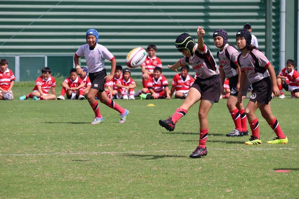 グラウンドいっぱいに ラグビーに励む両チームの子供たち。