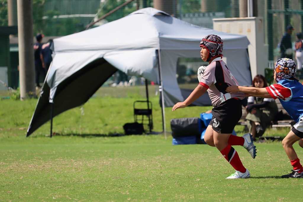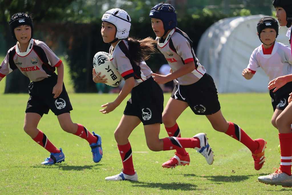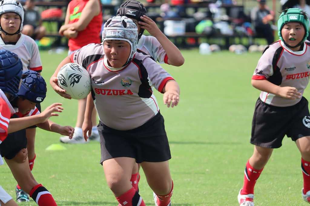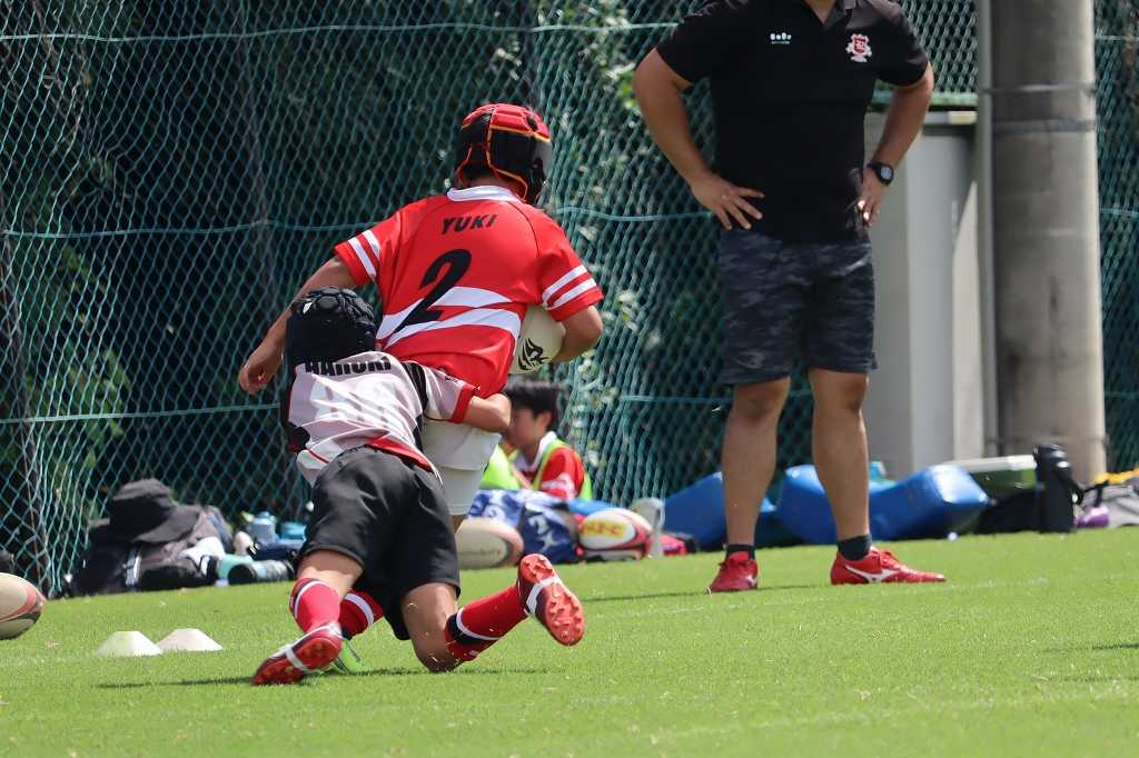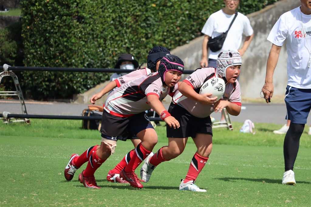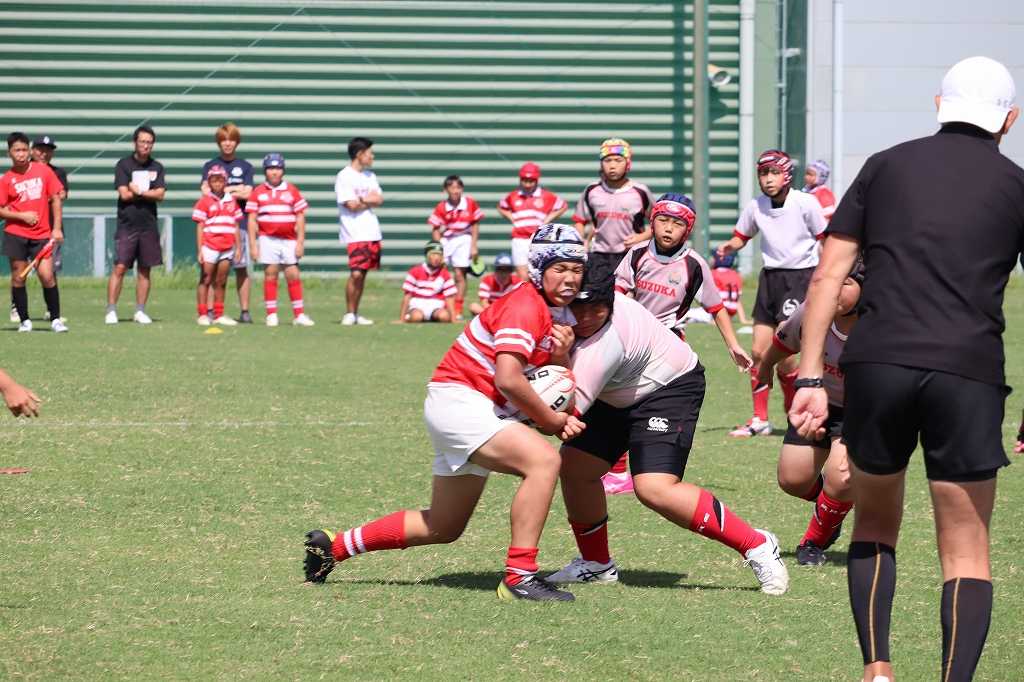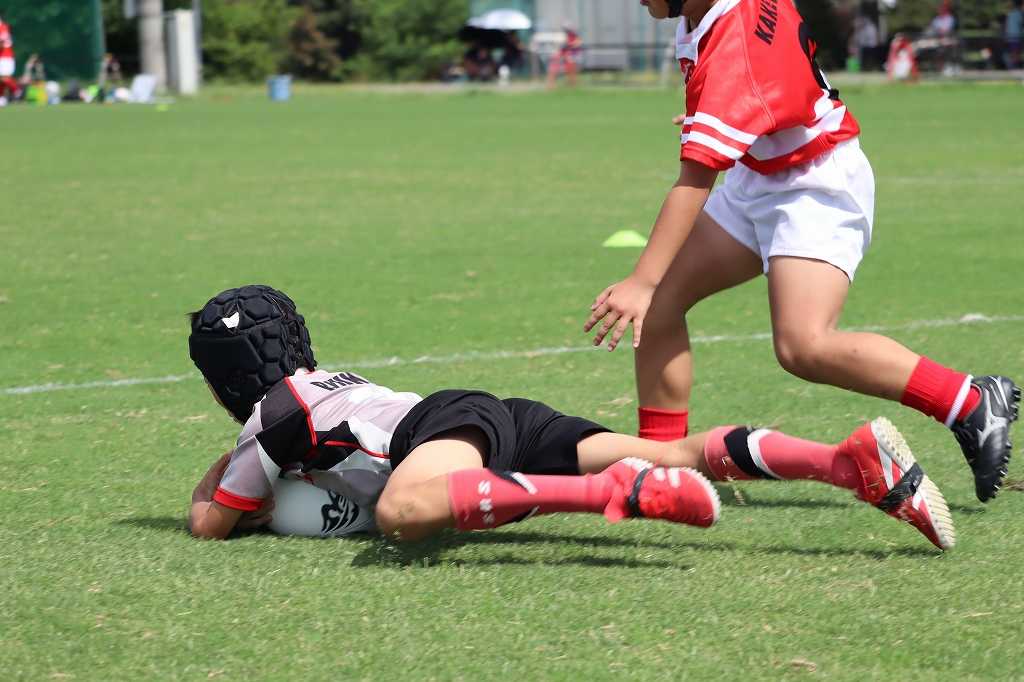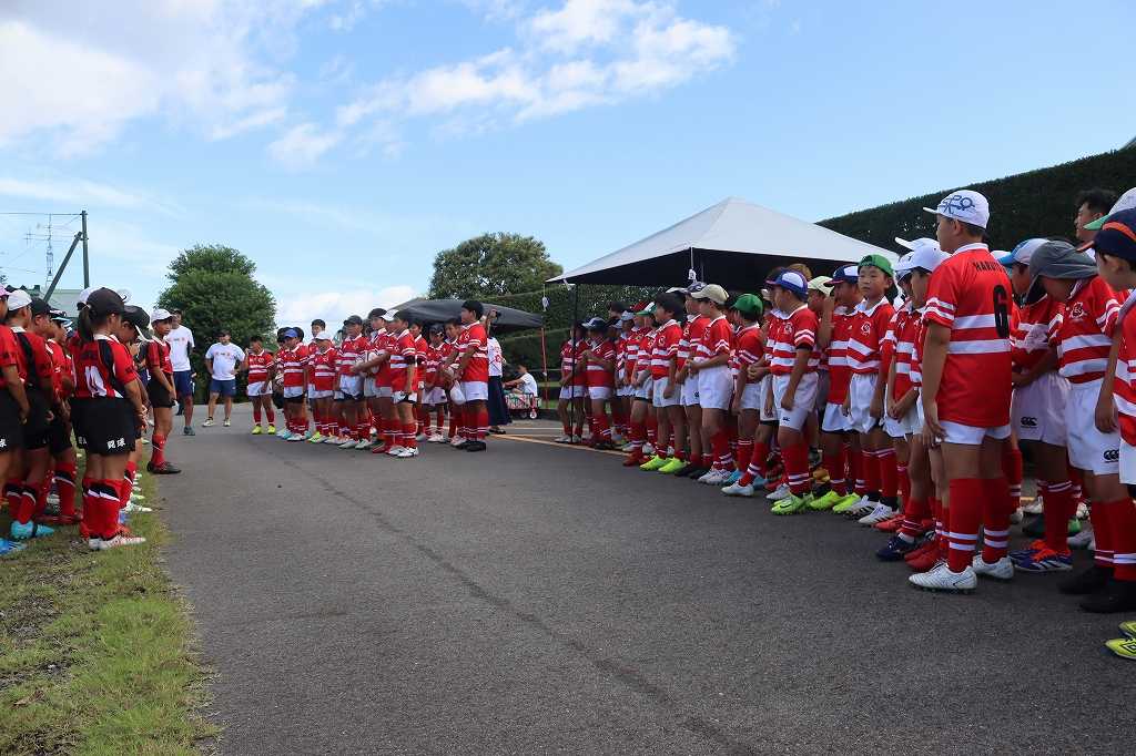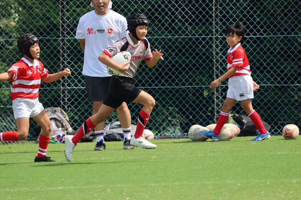 グラウンドいっぱいに ラグビーに励む両チームの子供たち。
