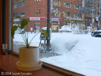 今日の札幌は猛吹雪! ササラ電車も大活躍でした。 全身雪ダルマになりながら道路際で見る姿も迫力満点で絵になるのですが、こうして温かいお店の窓辺から眺める普段着っぽい感じも大好きです。----おしらせ----【作品展やります】「市電日記2014~スロウな電車の原画展~」札幌市内で3/19~開催! >>詳細はこちら(※PC/携帯共用)【札幌の水彩色鉛筆画家】 ~イラストレーター鈴木周作~公式サイトも併せて御覧下さい>>[PC|Mobile|北斗星乗車記|えちてつ絵日記]