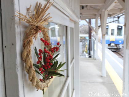 新年あけましておめでとうございます。 旧年中の沢山の御縁に感謝しつつ、ますます創作活動に精進して参ります。 本年もよろしくお願い致します。 元旦の福井はかなり激しい雨でした。 取材的にはせめて雪なら…というところですが、当地で新年を迎えられただけでも私にとっては大収穫だったのかな?とも思います。 今日一日、雨の日なりに駅や沿線の正月らしい風景をできるだけ探し歩いてみることにします。 昨晩遅くに訪れた線路際の神社に今朝もお参りしてきました。 参道の石段の途中を突然線路が横切っていて、建前としては線路侵入は勿論御法度ですが、踏切も別の参道も無いのでここを渡らないと参拝に行けないという何とも不思議なシチュエーションです。 さすがに普段は訪れる人も稀なんでしょうが、やはり元日とあっては初詣に来られる方も少なからずおられるのでしょう。 とりわけ今日は何度も警笛を鳴らしながら、ゆっくりゆっくり、運転士さんも相当神経を遣いながら通過されている様子が覗えました。 とある無人駅の待合室前には不相応なほど立派な門松が立てられていました。 5年前にも同じ風景を見た記憶があります。 後で訊けば地元の方が毎年立てて下さっているんだとか。 やっぱり地域に愛されている電車なんだなぁ…と、見ているだけで心が和む風景でした。 昨日もお昼はソースカツ丼、夜はおろし蕎麦だったのですが…(笑)。 元日から大好物を頂くことができただけでも大満足です♪----おしらせ----【作品掲載】えちぜん鉄道「平成26年版カレンダー」発売中!>>詳細はこちら(※PC/携帯共用)>>詳細はこちら(※PC/携帯共用)【作品掲載】季刊「スロウ」2013秋号発売中!>>詳細はこちら(※PC/携帯共用)>>詳細はこちら(※PC/携帯共用)【作品掲載】日本の美を伝える和風年賀状素材集「和の趣」午年版>>詳細はこちら(※PC/携帯共用)>>詳細はこちら(※PC/携帯共用)【札幌の水彩色鉛筆画家】 ~イラストレーター鈴木周作~公式サイトも併せて御覧下さい>>[PC|Mobile|北斗星乗車記|えちてつ絵日記]