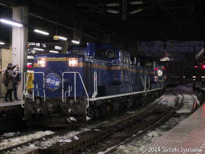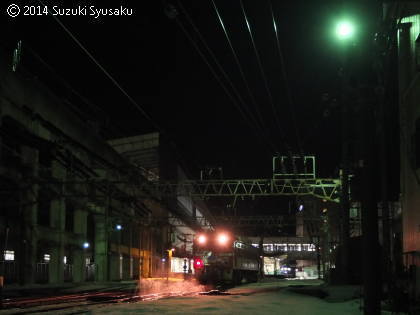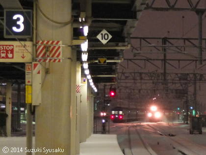 とりあえず、出発前に済ませておくべき作業だけはどうにか全て終わらせました。 年明け最初の「北斗星」で東京へ。 やがて函館が近付くにつれて、雪雲が途切れて綺麗な月が覗きはじめました。 函館駅での機関車交換、最後尾車両はすっかり白覆面です。 数分遅延は函館発車時点で一旦回復したものの、青函トンネルを抜けた後、青森手前の無人駅で突然停まるとそのまま動かなくなってしまいました。 時計を見ると深夜0時。 さすがにこの時間では車内放送もありませんから詳しい事情は分かりませんが、やはり雪の影響なんでしょうか?(※「北斗星乗車記」は現在執筆中。もう少々お待ち下さい )----おしらせ----【作品掲載】えちぜん鉄道「平成26年版カレンダー」発売中!>>詳細はこちら(※PC/携帯共用)>>詳細はこちら(※PC/携帯共用)【作品掲載】季刊「スロウ」2013秋号発売中!>>詳細はこちら(※PC/携帯共用)>>詳細はこちら(※PC/携帯共用)【札幌の水彩色鉛筆画家】 ~イラストレーター鈴木周作~公式サイトも併せて御覧下さい>>[PC|Mobile|北斗星乗車記|えちてつ絵日記]