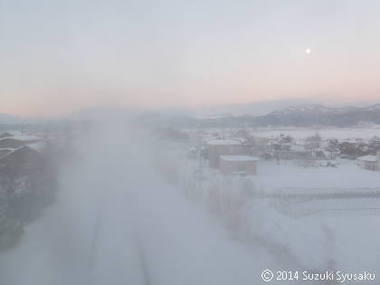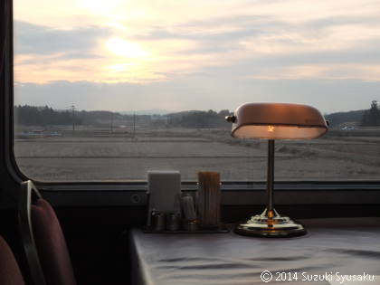 下り「北斗星」の朝、函館あたりで目が覚めました。 ピンク色の朝焼け空に丸い月、パステル画のような風景でした。 数分遅延でほぼ順調に走り続けていましたが、洞爺の手前で突然の信号待ち。 その後、いつもと違うホームに入ったので何だろうと思っていたら、ほどなく後続の貨物列車がやってきて、そのまま追い抜いて行ってしまいました。 機関車の保安機器不具合…と言うと、やはりATSの故障でしょうか? このまま洞爺でしばらく停車し、安全確保要員の到着を待って発車するとの車内放送が流れました。 結局、洞爺発車は30分ほどの遅延に。 機関車不具合ともなると相当時間が掛かるだろうと覚悟はしていたのですが、思ったよりも随分早い運転再開となりました。 多少の遅延はありましたが、むしろ遅延のおかげで見ることができた貴重なシーンも沢山ありました。 往復共に成果大、いつになく手応えのある新年最初の「北斗星」の旅でした。(※「北斗星乗車記」は現在執筆中。もう少々お待ち下さい )----おしらせ----【作品掲載】えちぜん鉄道「平成26年版カレンダー」発売中!>>詳細はこちら(※PC/携帯共用)>>詳細はこちら(※PC/携帯共用)【作品掲載】季刊「スロウ」2013秋号発売中!>>詳細はこちら(※PC/携帯共用)>>詳細はこちら(※PC/携帯共用)【札幌の水彩色鉛筆画家】 ~イラストレーター鈴木周作~公式サイトも併せて御覧下さい>>[PC|Mobile|北斗星乗車記|えちてつ絵日記]