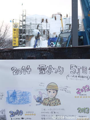 雪像作りが進む大通公園。 隊員の方が描かれた可愛いイラストで、これまで手掛けられた雪像やそれぞれの難易度などを紹介する大きなボードが立てられていました。 一見、若い方の作品かと思いきや、「雪像作りは19年目…」とありましたから、中堅~ベテランの隊員さんの作品でしょうか? 国の平和と我々の生命を守って下さる傍らで、こうして地域に沢山の笑顔も届けて下さる自衛隊の皆さんのご活躍が身近に感じられて、眺めていてちょっと嬉しくなりました。----おしらせ----【作品掲載】えちぜん鉄道「平成26年版カレンダー」発売中!>>詳細はこちら(※PC/携帯共用)>>詳細はこちら(※PC/携帯共用)【作品掲載】季刊「スロウ」2013秋号発売中!>>詳細はこちら(※PC/携帯共用)>>詳細はこちら(※PC/携帯共用)【札幌の水彩色鉛筆画家】 ~イラストレーター鈴木周作~公式サイトも併せて御覧下さい>>[PC|Mobile|北斗星乗車記|えちてつ絵日記]