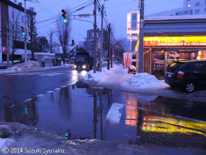 随分雪が積もったところに今日は気温が上がってしまい、おかげで道路は巨大な水溜りです。 毎年恒例、3月の「ギャラリー土土」さんでの原画展の案内ハガキが出来上がってきました。 デザインも概ね例年のパターンの踏襲で、いささか安直過ぎたかな?と思いつつも、その実、データ作成~発注段階で思わぬ苦労もあったのですが、ともかくこれでようやく肩の荷がひとつ降りた気がします。 正直、絵を描く以外のこういう作業は決して得意な方では無いのですが、でも逆にこういう作業こそきちんと取り組むのがプロの仕事なのかな?とも思います。 結局、何事も勉強…ということですね。----おしらせ----【作品展やります】「市電日記2014~スロウな電車の原画展~」札幌市内で3/19~開催! >>詳細はこちら(※PC/携帯共用)【札幌の水彩色鉛筆画家】 ~イラストレーター鈴木周作~公式サイトも併せて御覧下さい>>[PC|Mobile|北斗星乗車記|えちてつ絵日記]