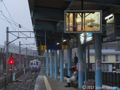 さすがに昨晩は早々に熟睡、おかげで今朝は気持ちよく目が覚めました。 本場・福井で「ちりとてちん」を観られるのも何となく嬉しいものです(笑)。 昨日の冷たい雨から一転、今日は素晴らしい青空に恵まれました。 冬の北陸でこういう好天は珍しいと地元の方にも言われましたが、だとすると今回の取材は結構ツキがあるのかも知れません。 今日も夕方まで、えちぜん鉄道の沿線取材。 せっかく綺麗に見えている白山がうまく納まる構図を探して、勝山永平寺線を中心に夕方までひたすら歩き回ります。 滞在中、今回もまた新しい発見が色々ありましたが、一方で、こんなことにも気付いていなかったのか!と愕然となる場面もありました。 5年間、年に何度も通い続けていても、まだまだ知らないことが一杯なんだなぁ…と、地元民でない自分の立ち位置が少々もどかしくも感じてしまいます。 でも、こういう「手が届きそうで届かない憧れ感」みたいなものが、結局は私の場合、次の創作へのモチベーションにも繋がっているのかな?とも思います。 福井を離れるJRの車窓から、黄昏の白山を背に解体されていく旧型電車の姿が見えました。 2両のうち1両は既に車体も殆ど無くなってしまっていたようです。 ある意味、私と福井を結び付けてくれたきっかけの一つと言えるかもしれない大好きな電車でした。 彼らを労うかのような素晴らしい青空の下、こうして最期の姿を見届けられたのも何かの運命でしょうか? 金沢、直江津と乗り継いで、普通列車で今夜は長岡まで。 札幌に戻る飛行機もやはり羽田経由ですが、東京までは敢えて新幹線を使わずに、普通列車利用で節約するかわりに1泊増やして寄り道しながら行こうという算段です。 まだまだ長い道中になりそうですが、今回ばかりはちょっとだけ旅を楽しんでしまおうと思います。----おしらせ----【作品掲載】えちぜん鉄道「平成26年版カレンダー」発売中!>>詳細はこちら(※PC/携帯共用)>>詳細はこちら(※PC/携帯共用)【作品掲載】季刊「スロウ」2013秋号発売中!>>詳細はこちら(※PC/携帯共用)>>詳細はこちら(※PC/携帯共用)【札幌の水彩色鉛筆画家】 ~イラストレーター鈴木周作~公式サイトも併せて御覧下さい>>[PC|Mobile|北斗星乗車記|えちてつ絵日記]