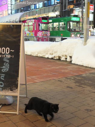 西4丁目電停前で黒猫に遭遇! しばらく前からこのあたりに出没するようになって、結構話題になっているようです。 本当はどちらかといえばイヌ派の私ですが、電車や駅との絡みとなるとなぜかネコの印象が強くなるから不思議です。 こういう風景も今後のテーマですね。----おしらせ----【作品掲載】えちぜん鉄道「平成26年版カレンダー」発売中!>>詳細はこちら(※PC/携帯共用)>>詳細はこちら(※PC/携帯共用)【作品掲載】季刊「スロウ」2013秋号発売中!>>詳細はこちら(※PC/携帯共用)>>詳細はこちら(※PC/携帯共用)【札幌の水彩色鉛筆画家】 ~イラストレーター鈴木周作~公式サイトも併せて御覧下さい>>[PC|Mobile|北斗星乗車記|えちてつ絵日記]