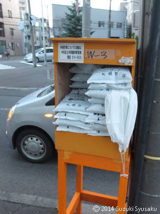 今年も交差点に「砂箱」が現れました。 ちなみに冬になると福井の交差点に置かれる「ひとかき運動」の緑のスコップは札幌では見かけないようです。 雪質の違いか? 文化の違いか? ちょっと興味深いところです。----おしらせ----【作品掲載】日本の美を伝える和風年賀状素材集「和の趣」未どし版発売中!>>詳細はこちら(※PC/携帯共用)【作品掲載】季刊「スロウ」2014秋号発売中!>>詳細はこちら(※PC/携帯共用)【作品掲載】小学館SJムック「とっておき寝台列車の旅」発売中! >>詳細はこちら(※PC/携帯共用)【札幌の水彩色鉛筆画家】 ~イラストレーター鈴木周作~公式サイトも併せて御覧下さい>>[PC|Mobile|北斗星乗車記|えちてつ絵日記]