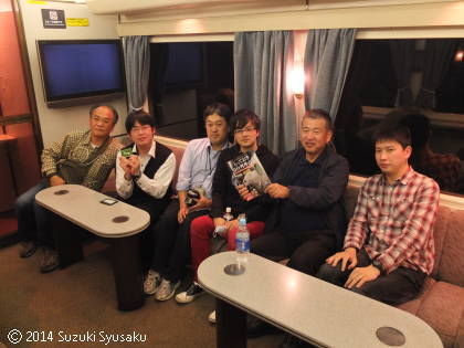 たまたま居合わせたロビーカーで仲良くなった皆さん。 「北斗星」をはじめ夜行列車が大好きな方々ばかりで、私のブログや旅行誌の記事などを御覧頂いている方も大勢いらっしゃいました。 有難い事に、私が乗車記を寄稿させて頂いた小学館SJムック「とっておき寝台列車の旅」を持参されていた方もおられて、僭越ながらサインをさせて頂いたらとても喜んで下さいました。 最近では以前にも増して混み合っていることが多い「北斗星」ですが、時にはこういう出会いがあるのも嬉しいものですね。 (※写真は皆さんの了解を頂いた上で掲載しています) 青森駅での機関車交換も注目の的。 この日は「カシオペア」用の銀色の機関車でした。----おしらせ----【作品掲載】日本の美を伝える和風年賀状素材集「和の趣」未どし版発売中!>>詳細はこちら(※PC/携帯共用)【作品掲載】季刊「スロウ」2014秋号発売中!>>詳細はこちら(※PC/携帯共用)【作品掲載】小学館SJムック「とっておき寝台列車の旅」6/19発売! >>詳細はこちら(※PC/携帯共用)【札幌の水彩色鉛筆画家】 ~イラストレーター鈴木周作~公式サイトも併せて御覧下さい>>[PC|Mobile|北斗星乗車記|えちてつ絵日記]