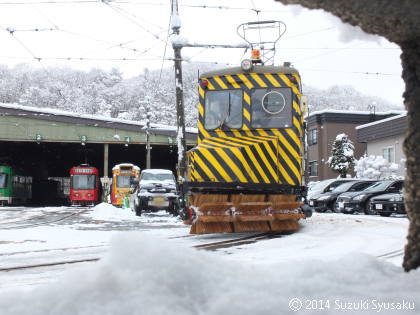 今日の取材は午後からの予定。 ギリギリまで宿でゆっくり眠りたいところでしたが、せっかくなので少しだけ散歩に出掛けてきました。 小雨交じりの空模様もむしろ風情があって良い感じでした。 嵐電…というより個人的にはどうしても「京福」と呼んでしまいます。 踏切の音に気付いて近付くと、懐かしい色の電車がやってきました。 昔はえちぜん鉄道と同じ会社の路線だったんだよなぁ…と思うと今でもちょっと不思議な気がします。 午後の新幹線で京都から米原へ。 今日の取材は軽く眺める程度ですが、それでも見ておくのと見ておかないのでは後々の仕事に大きく関わってくるものです。 小一時間ほどの取材を済ませて、今日は少し早めに福井に向います。 同行編集者さんが手配して下さった宿はいつもの定宿のお隣でした。 リクエストしたわけではないのですが、指定された部屋はえちぜん鉄道の線路際。 見込み工事?で既に完成済みの北陸新幹線高架橋を利用した、えちぜん鉄道の新しい仮駅と仮設線路がだいぶ出来上がっているのが見えました。 明日は早朝…というより未明からの取材予定。 早めに休んでおくつもりでしたが、取材写真の整理等々で結局今夜も日付が変わるまで夜更かししてしまいました。----おしらせ----【作品掲載】日本の美を伝える和風年賀状素材集「和の趣」未どし版発売中!>>詳細はこちら(※PC/携帯共用)【作品掲載】季刊「スロウ」2014秋号発売中!>>詳細はこちら(※PC/携帯共用)【作品掲載】小学館SJムック「とっておき寝台列車の旅」発売中! >>詳細はこちら(※PC/携帯共用)【札幌の水彩色鉛筆画家】 ~イラストレーター鈴木周作~公式サイトも併せて御覧下さい>>[PC|Mobile|北斗星乗車記|えちてつ絵日記]