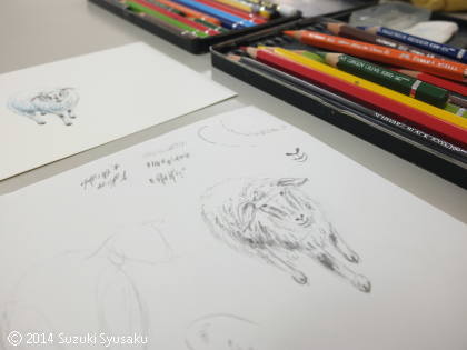 今朝のうちに大急ぎで作例を描いて、その制作過程をまとめた資料も作って持ってきました。 午後からNHK文化センター新さっぽろ教室。 先週お約束した通り、今回は羊の描き方の講釈です。 今宵は実に171年ぶりの「ミラクルムーン」なんだとか。 天体に疎いので詳しいことは分からないのですが…。----おしらせ----【作品掲載】日本の美を伝える和風年賀状素材集「和の趣」未どし版発売中!>>詳細はこちら(※PC/携帯共用)【作品掲載】季刊「スロウ」2014秋号発売中!>>詳細はこちら(※PC/携帯共用)【作品掲載】小学館SJムック「とっておき寝台列車の旅」6/19発売! >>詳細はこちら(※PC/携帯共用)【札幌の水彩色鉛筆画家】 ~イラストレーター鈴木周作~公式サイトも併せて御覧下さい>>[PC|Mobile|北斗星乗車記|えちてつ絵日記]