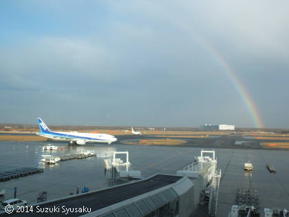 今月二度目の、ちょっとハードな本州出張。 新千歳空港に着くと大きな虹が出ていました。 初めて乗るエア・ドゥ神戸便は、もう会えないと思っていた「ベア・ドゥ ドリーム号」でした。 思わずボーディングブリッジで立ち止まってカメラを構えると、「この飛行機、あと4日で引退なんです。撮って下さってありがとうございます」とCAさんに御礼を言われてしまいました。 神戸までは約2時間、いつもの羽田便よりも幾分のんびりと空の旅を満喫できました。 やがて左手に街の夜景が広がると大きく左旋回、どうやら一旦神戸を通り過ぎて西側から着陸するようです。 「今日は夜景が綺麗に見えています。機内の照明を一段暗く致しますのでどうぞ御覧下さい…」とのアナウンスにちょっと嬉しくなりましたが、今思えば黒いハンカチで光を遮って何とか夜景を撮ろうと苦心していた私を見かねてのお気遣いだったのかも知れません。 まるでベア・ドゥが神戸の街に別れを告げているような、忘れられない光景でした。 今月30日のラストフライを前に、翌28日からの運行スケジュールはWebサイトで告知されていましたが、今日のこの便に使われるという情報はどこにも載ってはいませんでした。 もっとも翌朝の新千歳発の便に使われるということは、B737-500で運航される便のうち、今夜のうちに新千歳に戻れる神戸往復便の可能性もあるかな?…と、ちょっとだけ期待はしていたのですが…。 ともあれ、翌日からは福島、富山、釧路、羽田…どうやらこの日が最後の神戸空港だったようです。 人影もまばらな展望デッキに立って、慌しく折り返していく「ベア・ドゥ ドリーム号」が見えなくなるまで見送りました。 帰札予定は12月1日、私にとってもこれが本当の見納めになりそうです。----おしらせ----【作品掲載】日本の美を伝える和風年賀状素材集「和の趣」未どし版発売中!>>詳細はこちら(※PC/携帯共用)【作品掲載】季刊「スロウ」2014秋号発売中!>>詳細はこちら(※PC/携帯共用)【作品掲載】小学館SJムック「とっておき寝台列車の旅」発売中! >>詳細はこちら(※PC/携帯共用)【札幌の水彩色鉛筆画家】 ~イラストレーター鈴木周作~公式サイトも併せて御覧下さい>>[PC|Mobile|北斗星乗車記|えちてつ絵日記]